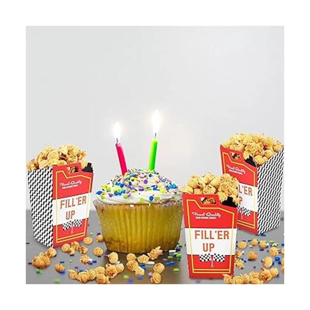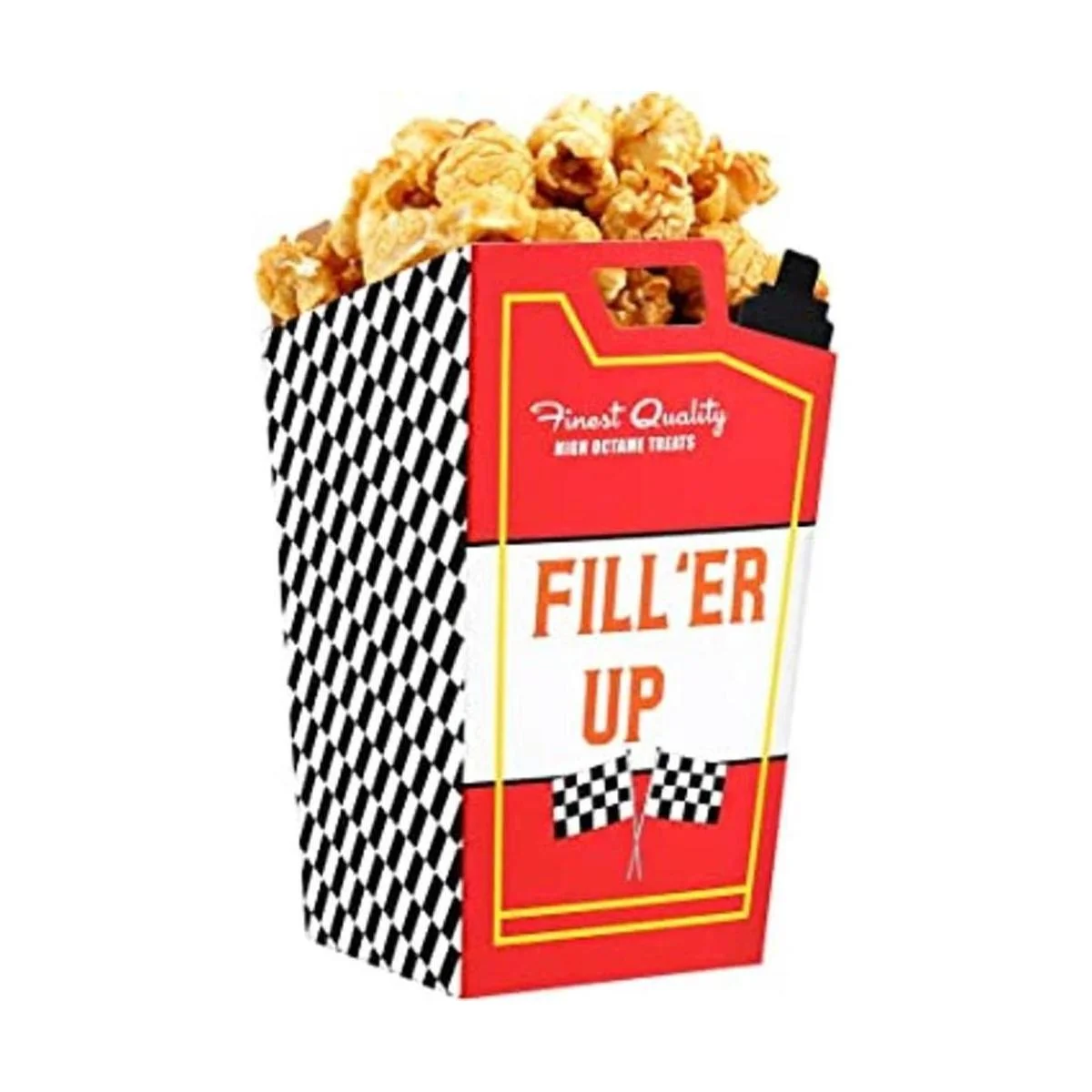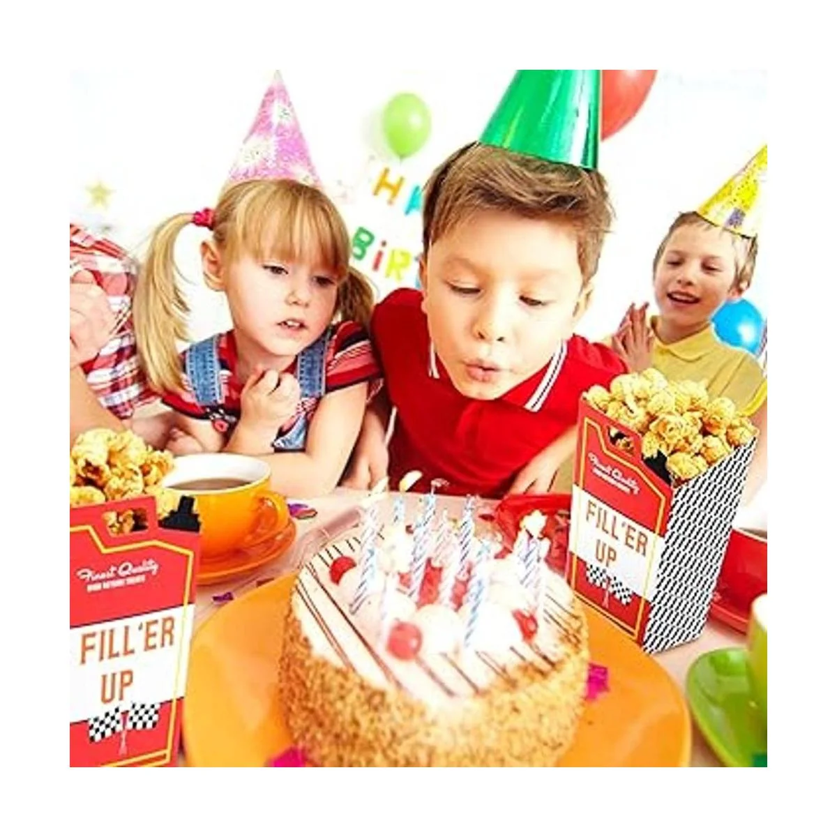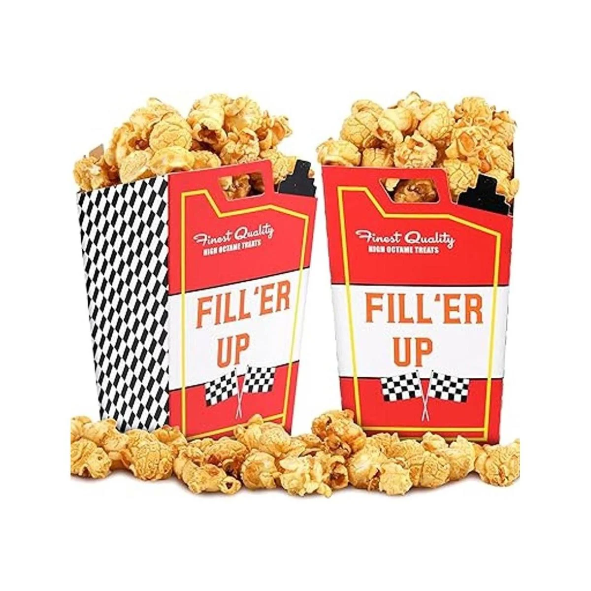 Suministros útiles para fiestas: las cajas de regalo de palomitas de maíz de carreras son adecuadas para varios tipos de alimentos de fiesta; puedes llenarlas con dulces o aperitivos salados, como palomitas de maíz, maíz de caramelo, chocolates, dulces y otras golosinas, haciendo que tu comida se vea deliciosa y hermosa para la fiesta