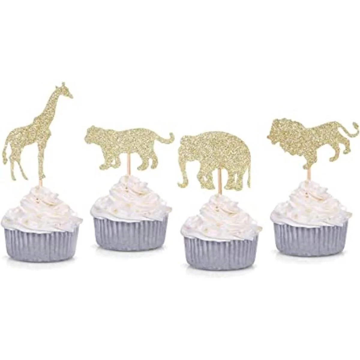 24 cuentos dorados con purpurina para decoración de cupcakes de animales, elefantes, jirafas, leones, tigre para baby shower, cumpleaños, fiestas.