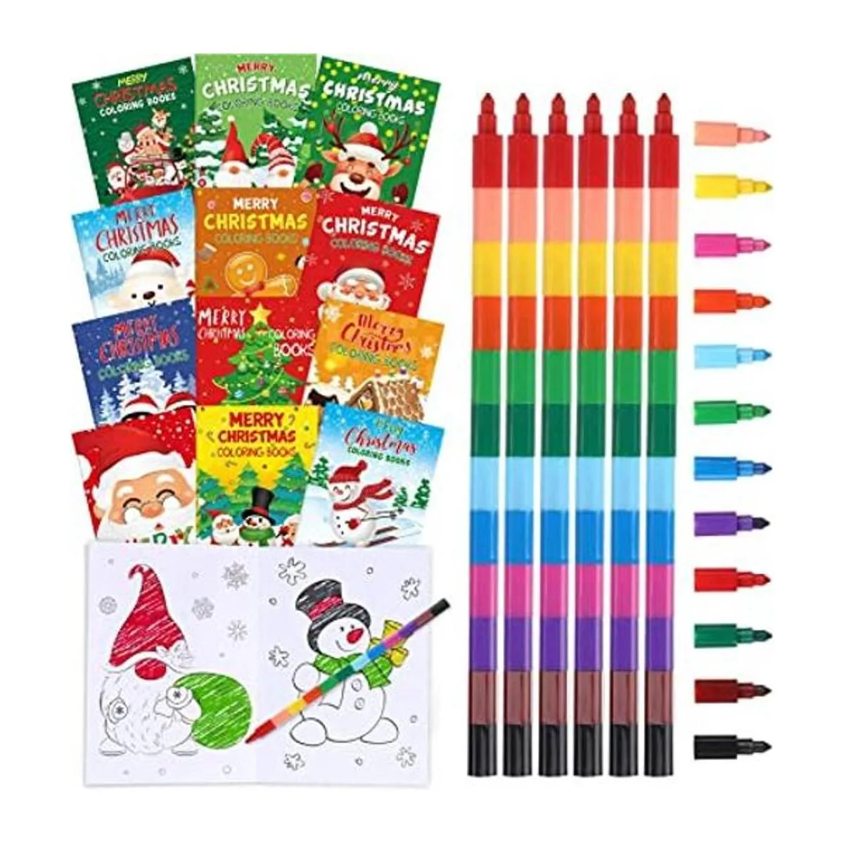 24 libros para colorear de Navidad con 24 crayones apilables para niños, recuerdos de fiesta, libros de actividades navideñas, lápices de arcoíris, calcetines de Navidad, suministros de fiesta para niños, escuela, actividades en el aula