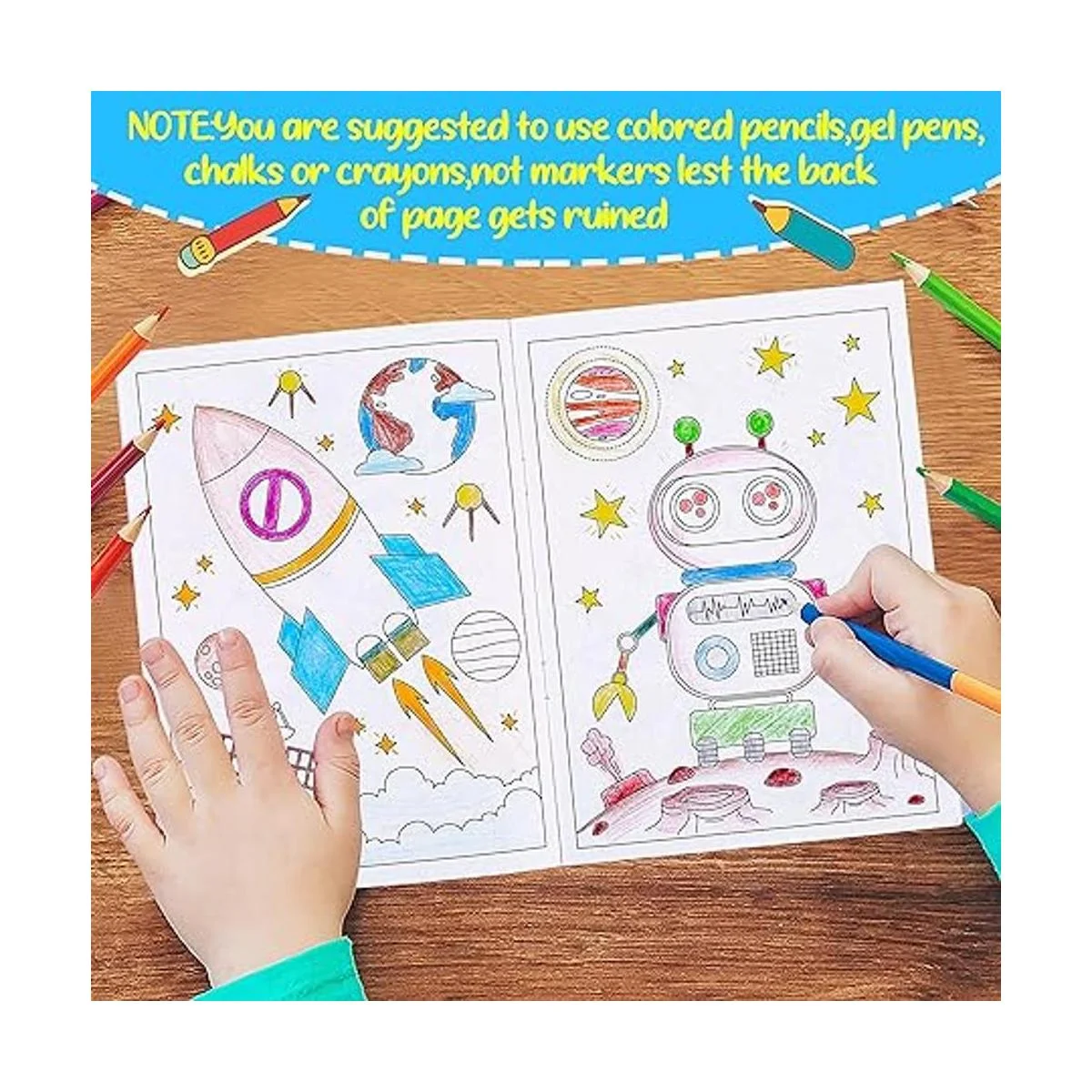 Material: las páginas están hechas de papel de grosor medio. Pero utiliza lápices de colores, bolígrafos de gel, tizas o crayones, no marcadores para que la parte posterior de la página se arruine.