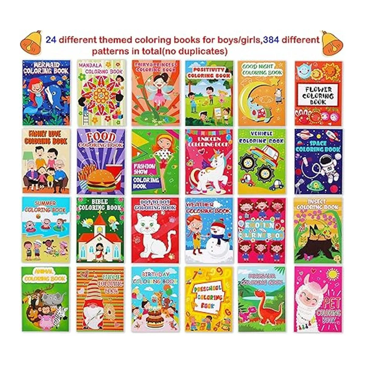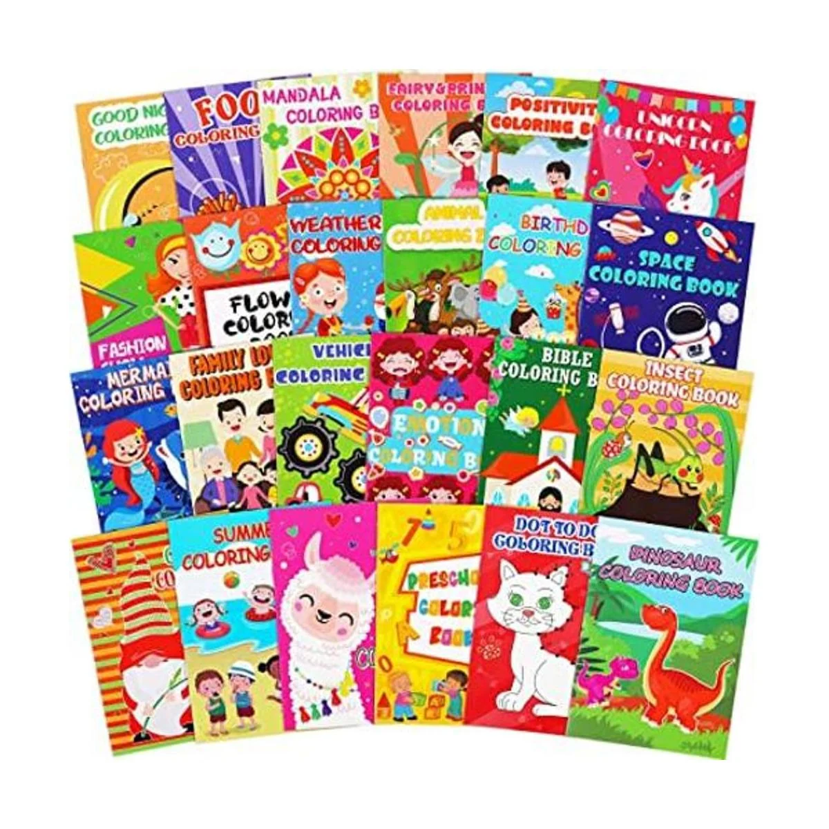 24 libros para colorear temáticos: mandala, unicornio, dinosaurio, espacio, sirena, gnomo, punto a punto, mascota, comida, animal, positividad, insecto, Biblia, cumpleaños, preescolar, vehículo, clima, desfile de moda, flor, verano, hada y princesa, emoción, buenas noches, amor familiar.