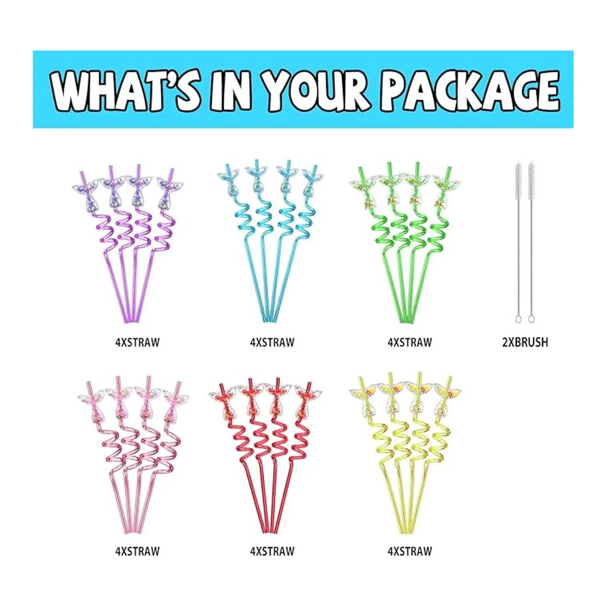 24 pajitas de sirena con purpurina para fiestas de cumpleaños con 2 brochas de limpieza