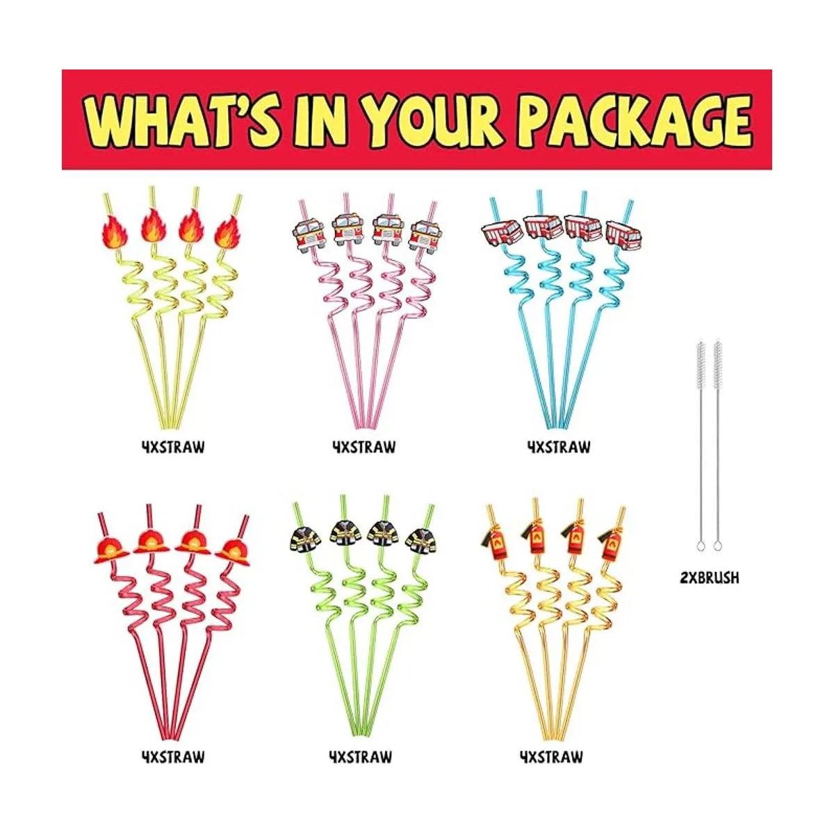 24 pajitas para fiestas de camiones de bomberos para suministros de fiesta de cumpleaños con 2 cepillos de limpieza