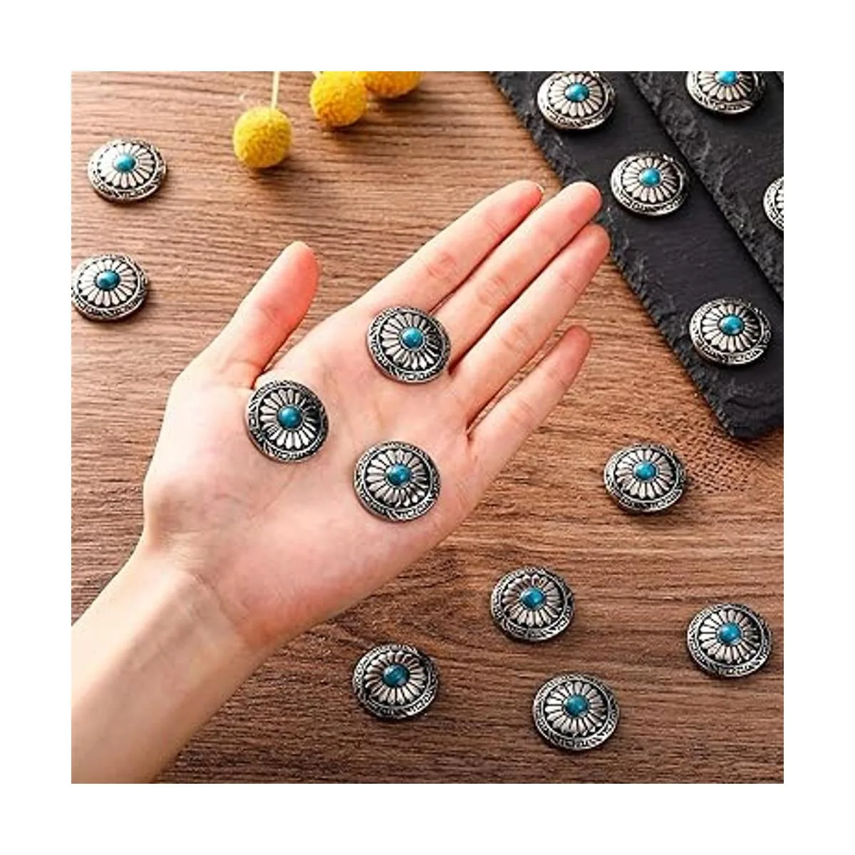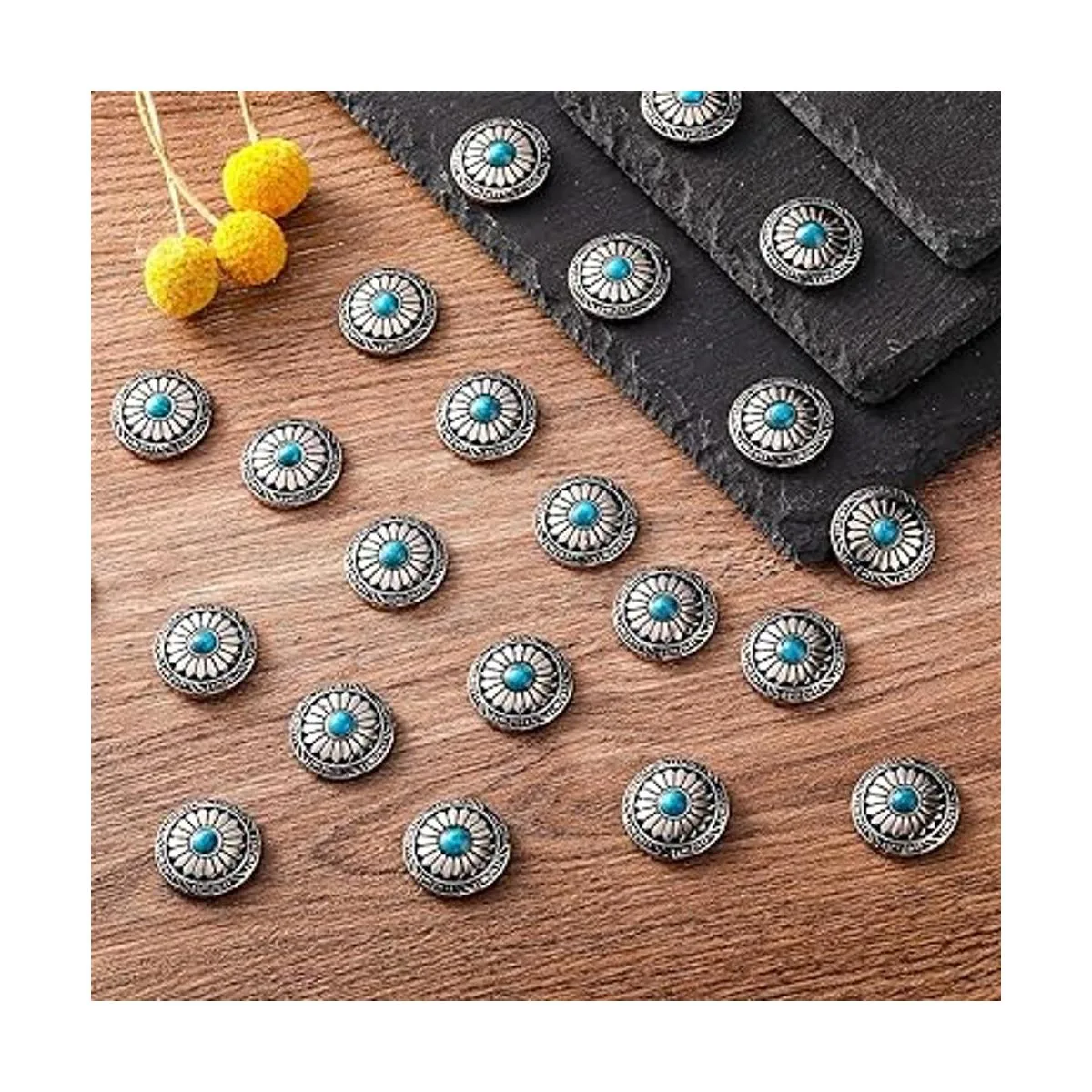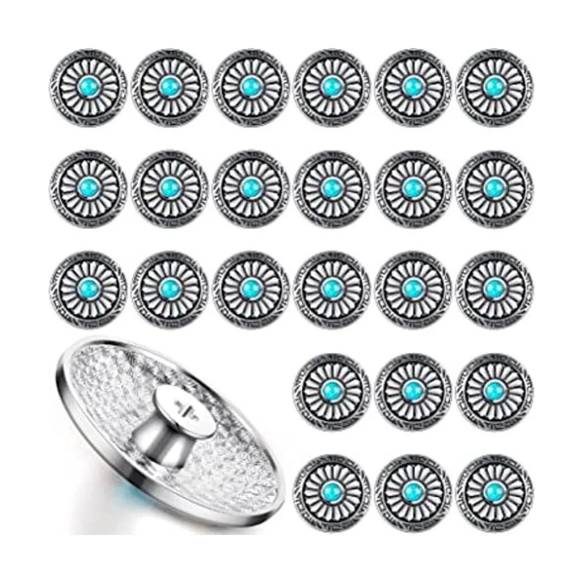 24 piezas de conchos redondos de imitación turquesa, girasol, hebilla decorativa, botones de girasol, botones de rosca para manualidades, cinturón de cuero, plata y azul