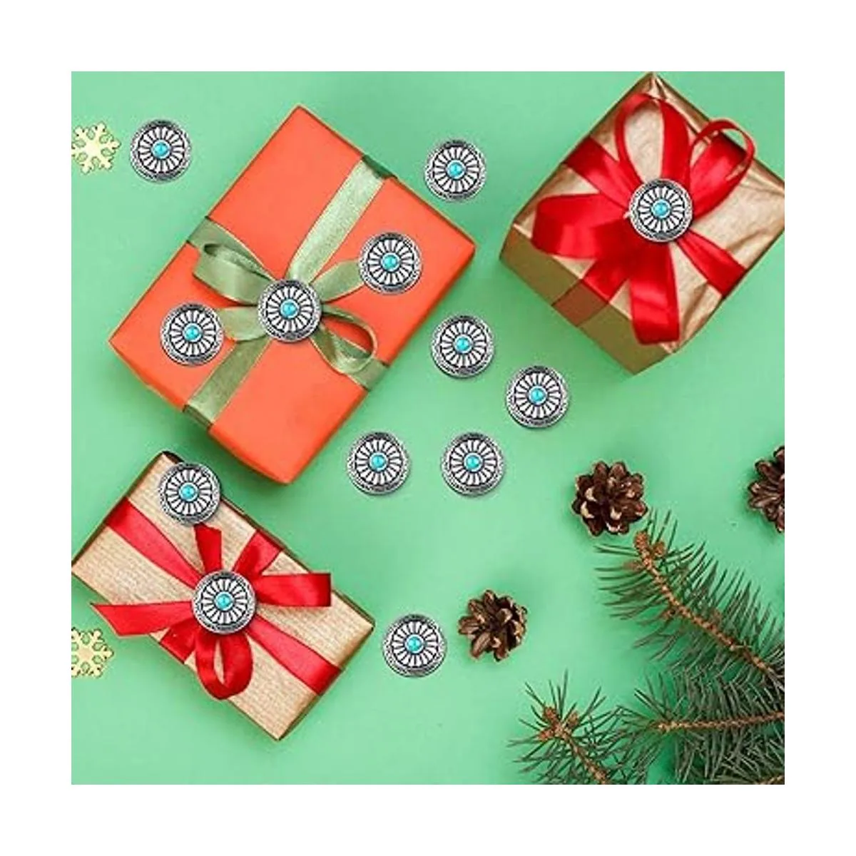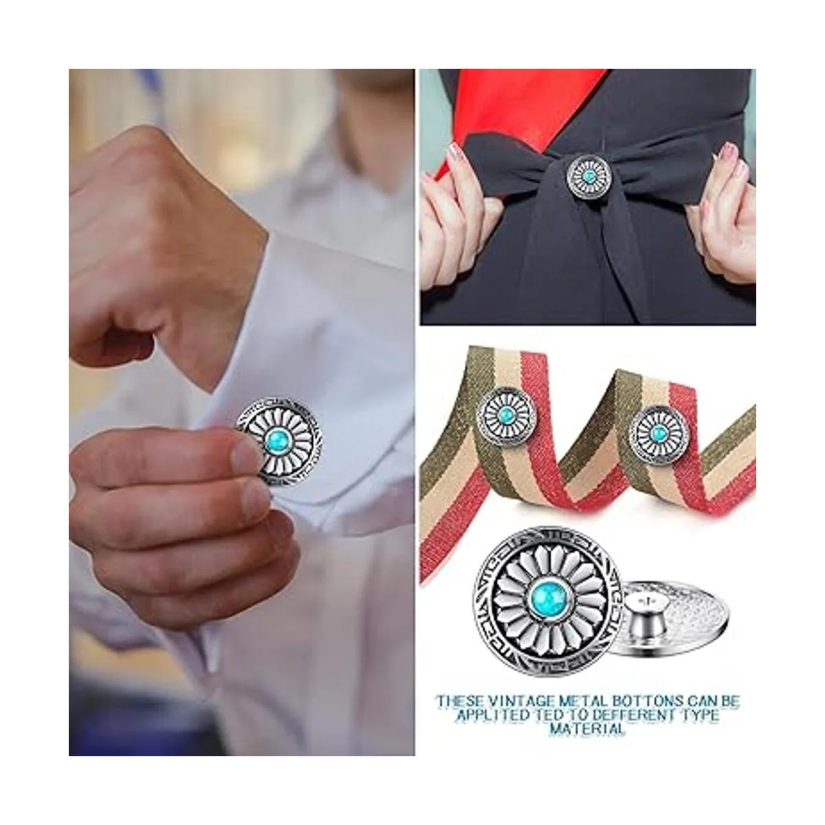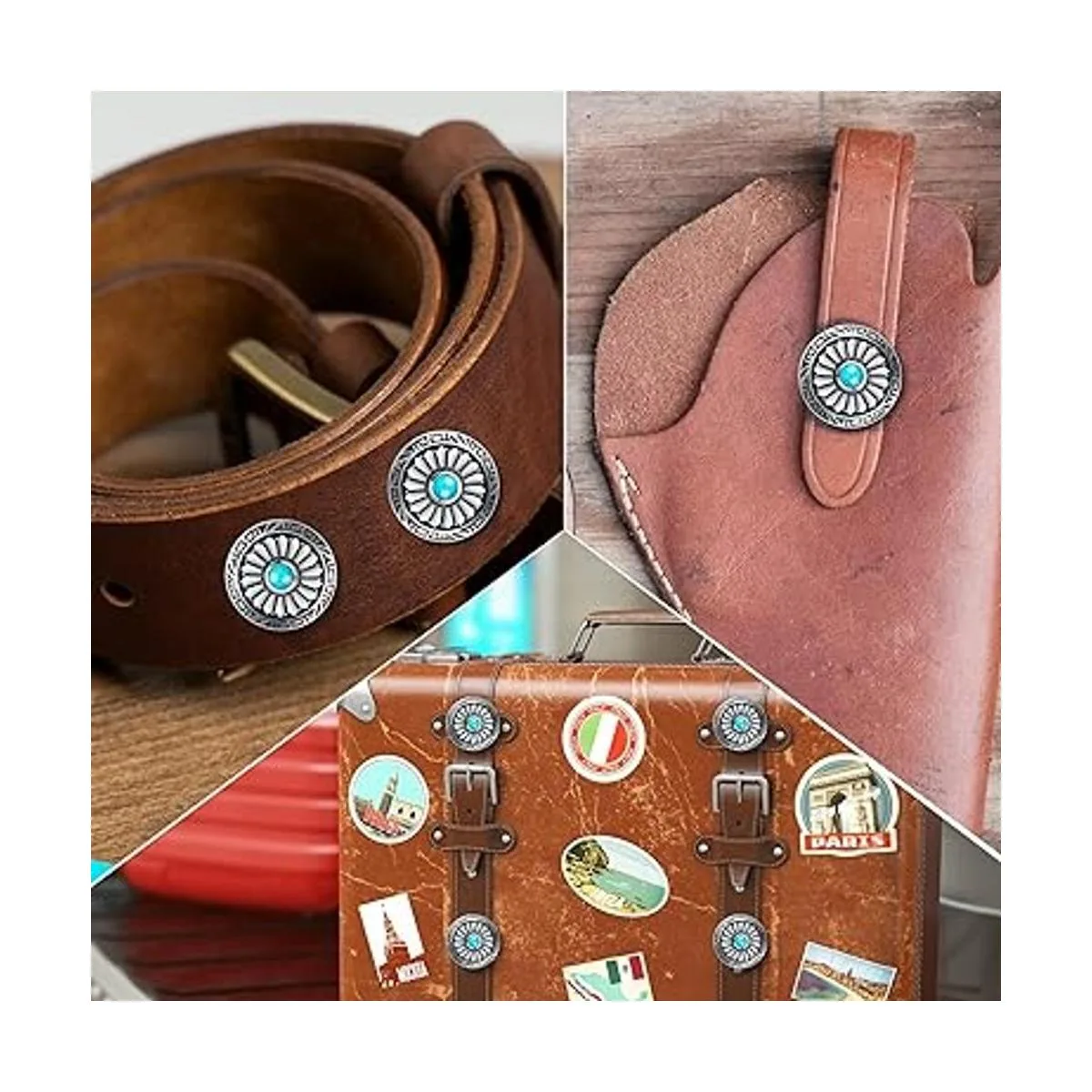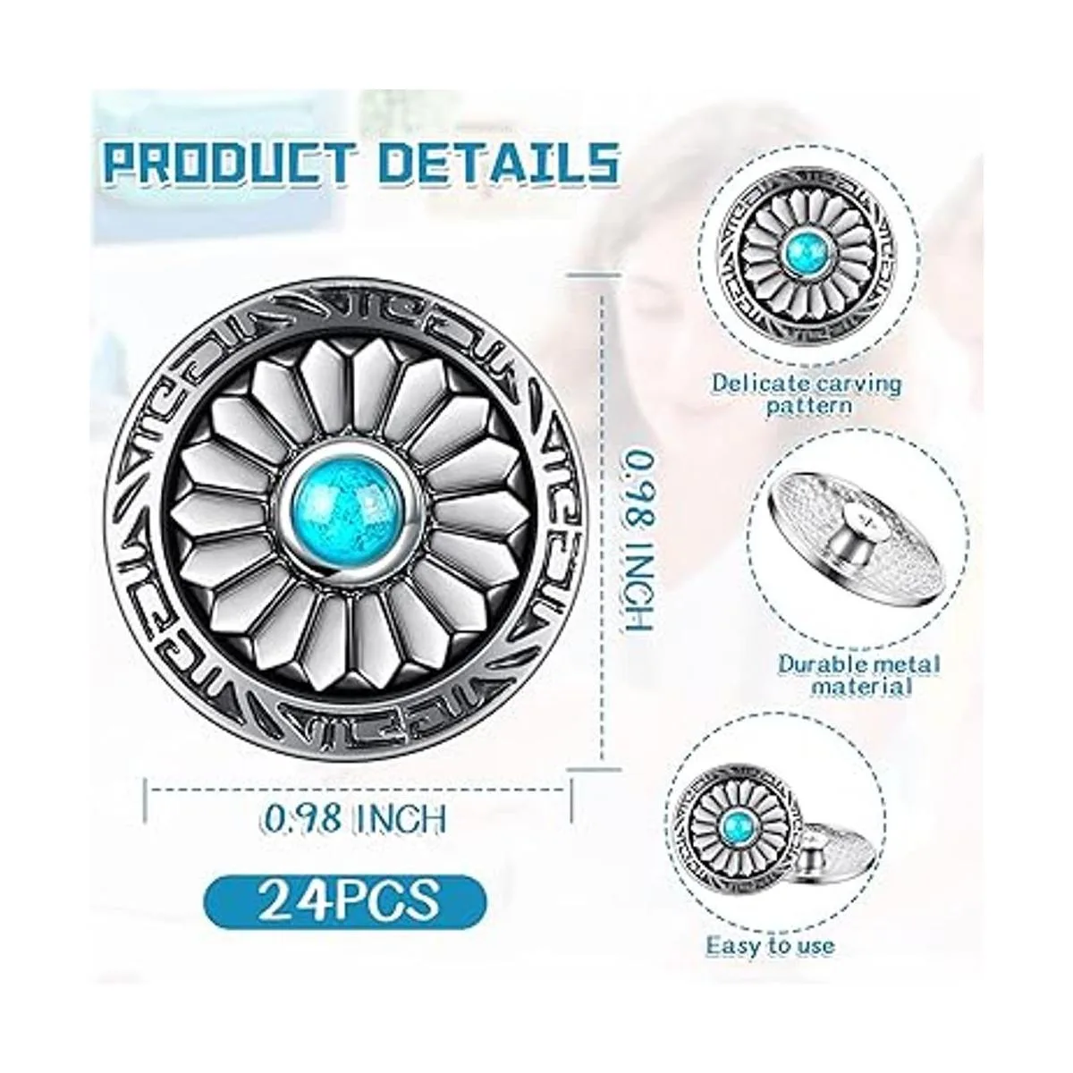 24 piezas de conchos redondos de imitación turquesa, girasol, hebilla decorativa, botones de girasol, botones de rosca para manualidades, cinturón de cuero, plata y azul