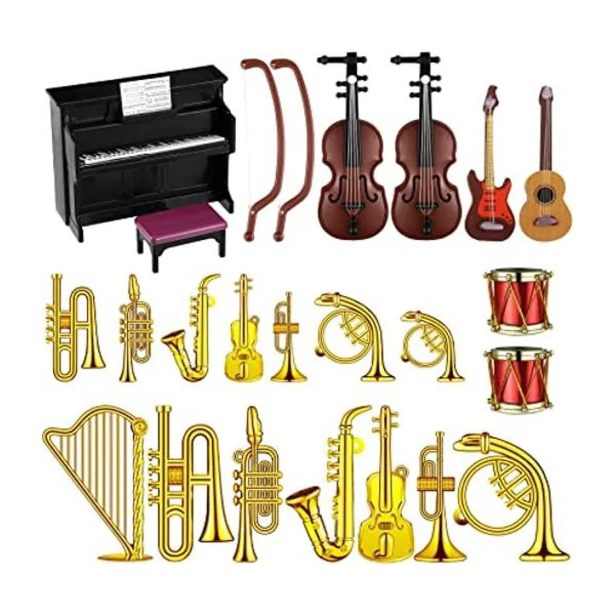 Juego de instrumentos musicales: recibirás un conjunto de 24 piezas de instrumentos musicales en miniatura, incluyendo 1 piano y silla, 1 partitura de música, 1 guitarra acústica, 1 guitarra eléctrica, 2 violines, 2 lazos de violín, 2 tambores, además, se incluye un kit de instrumentos dorados de 14 piezas, como violonchelo, arpa, saxofón, tuba, trompeta, cuerno, tambores y más, un juego completo para decorar tu obra de arte