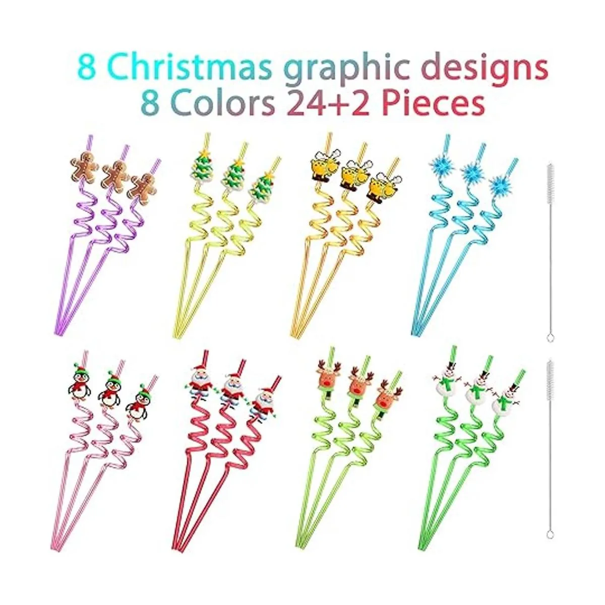 Diseño único: empaquetado con 24 pajitas rizadas con patrón de Navidad en 8 estilos de diseño diferentes, 3 pajitas en cada estilo, 8 colores, atractivas y creativas, adecuadas para niños y adultos. El color es rico, por lo que puede satisfacer las necesidades de personas a las que les gustan las pajitas tontas de diferentes colores.
