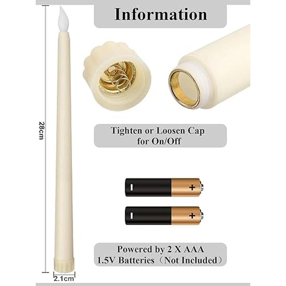 Velas decorativas ideales: cada vela parpadeante sin llama mide 0.8 x 11 pulgadas, adecuada para todos los candelabros estándar y cónicos de cristal, se puede notar fácilmente, cada vela LED necesita 2 pilas AAA no incluidas en el paquete, fácil de reemplazar