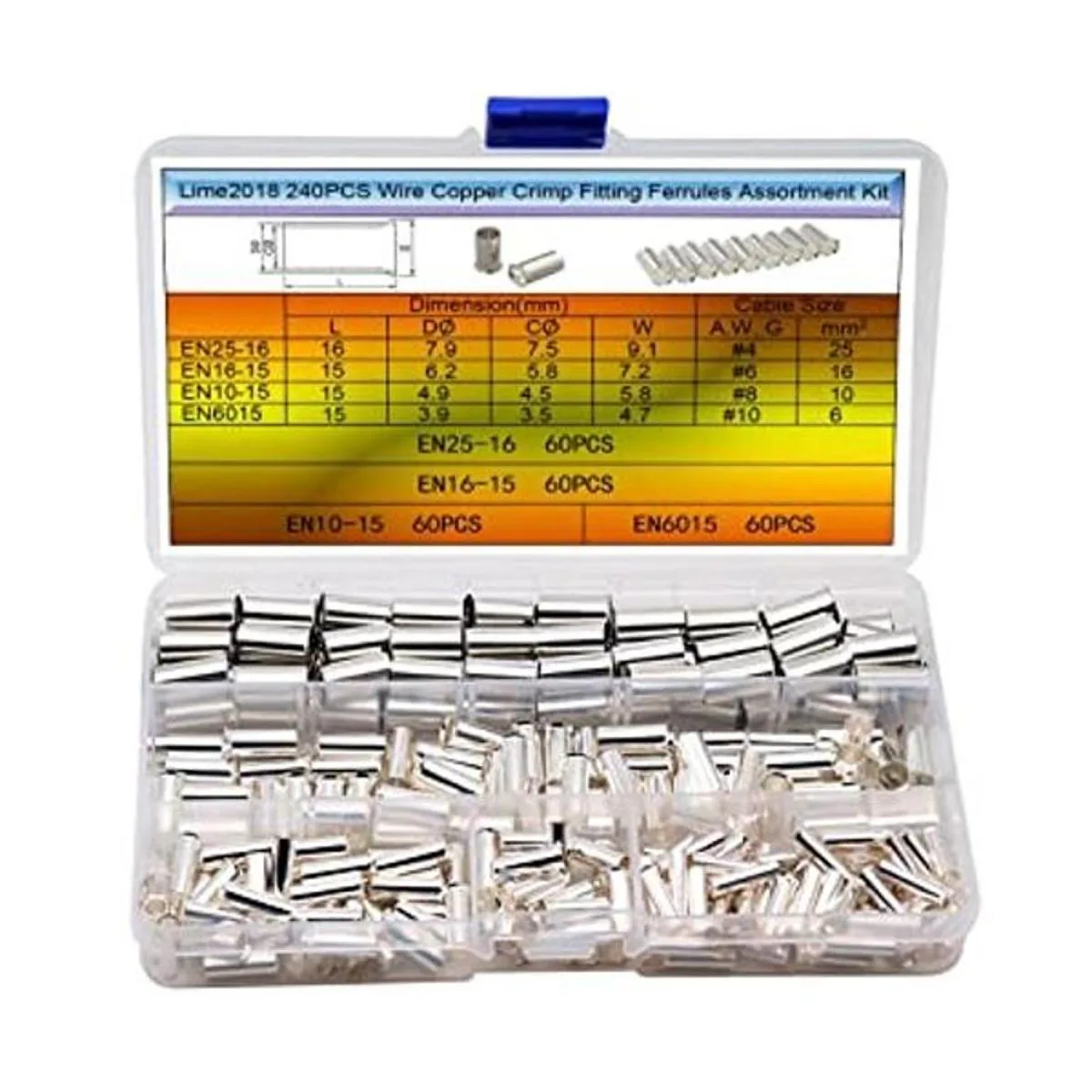 240 casquillos de alambre de cobre para engarzar 4 tipos de calibre AWG 4, 6, 8, 10 no aislados de la carcasa del cable de la virola Pin del cable del terminal, ampliamente utilizado en electrónica, equipos de comunicación, industria