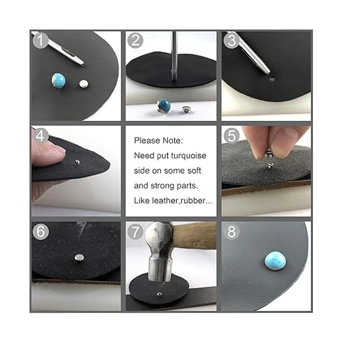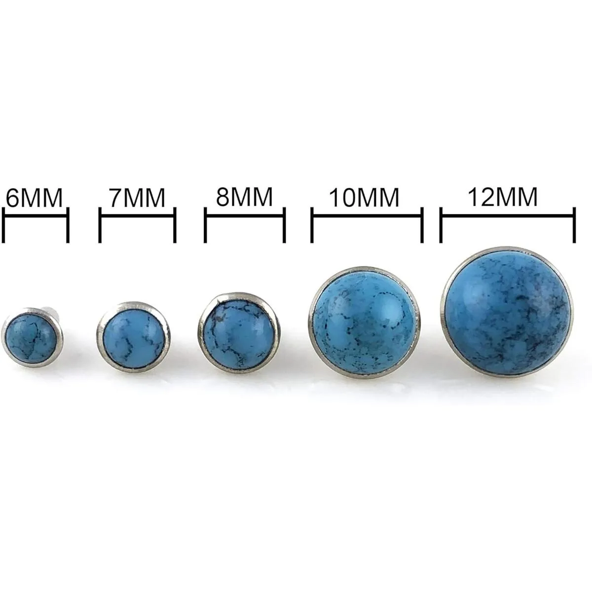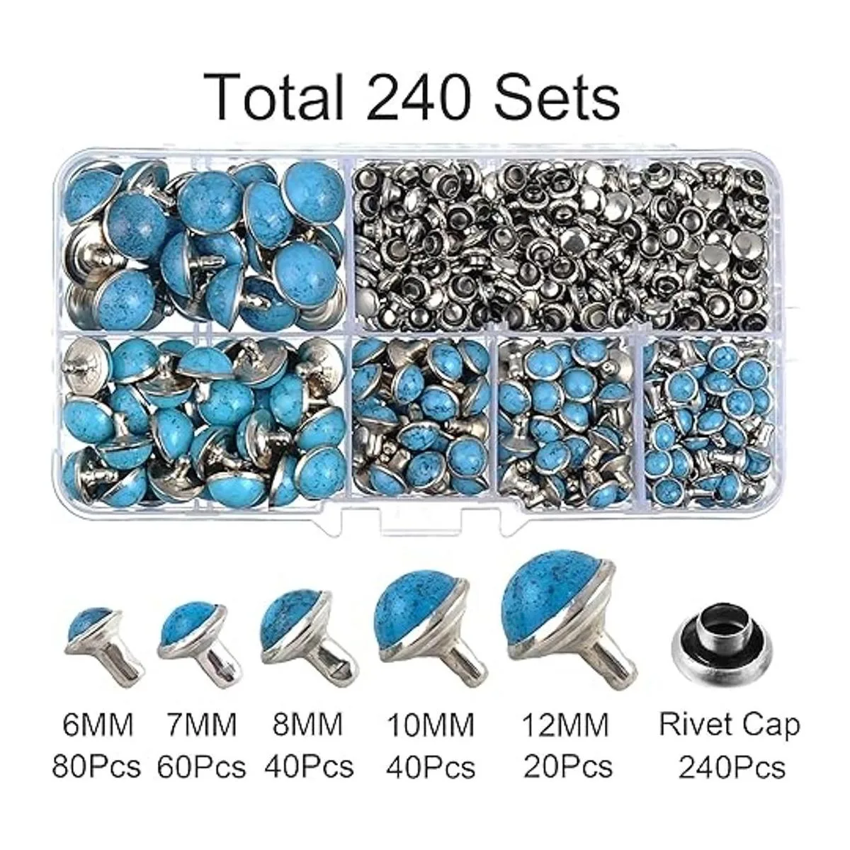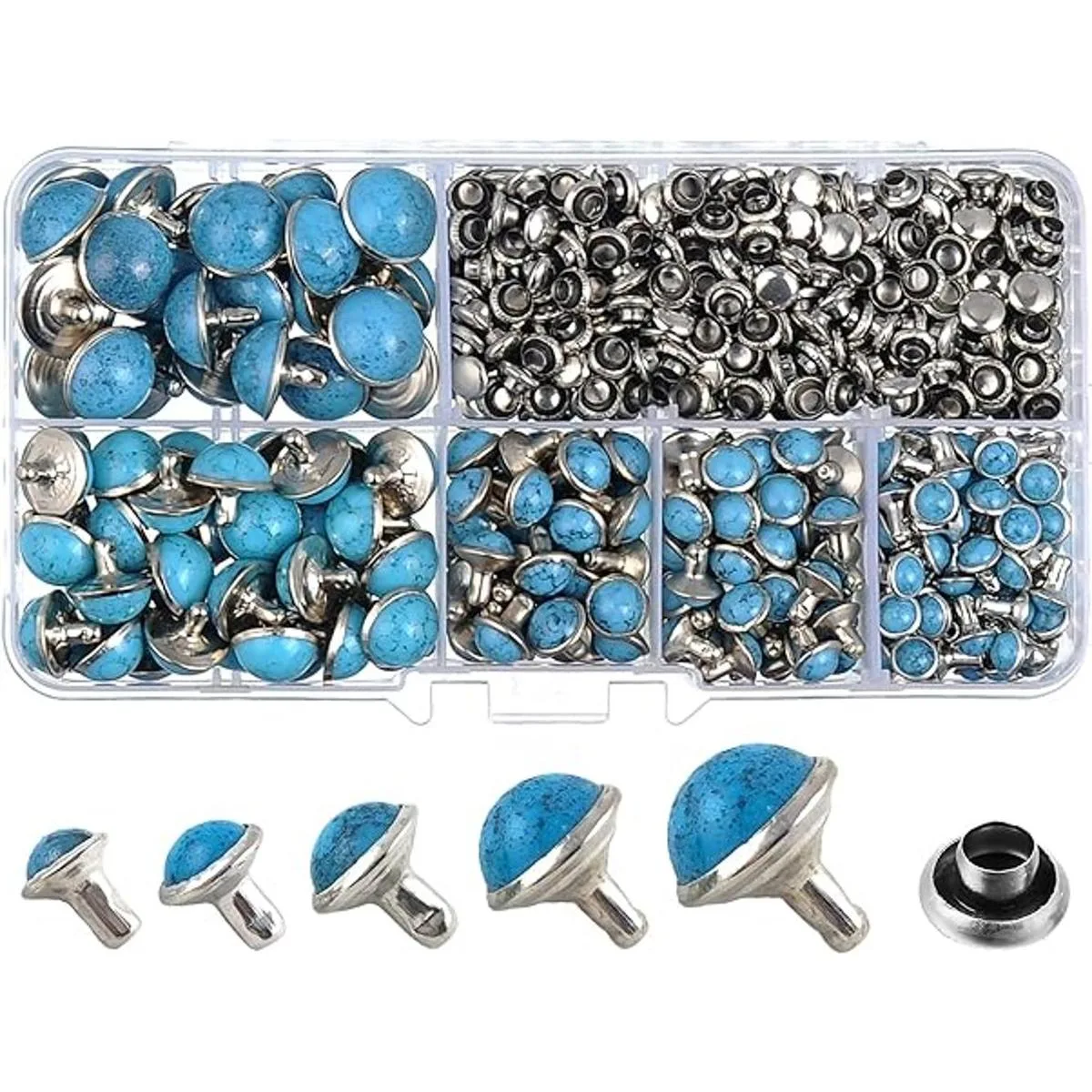 Material: acrílico de imitación azul turquesa con base de cobre y tapa de hierro. Diámetro de la cabeza: mezcla de 0.236 in, 0.276 in, 0.315 in, 0.394 in y 0.472 in. Diámetro de la tapa del remache: 0.236 in