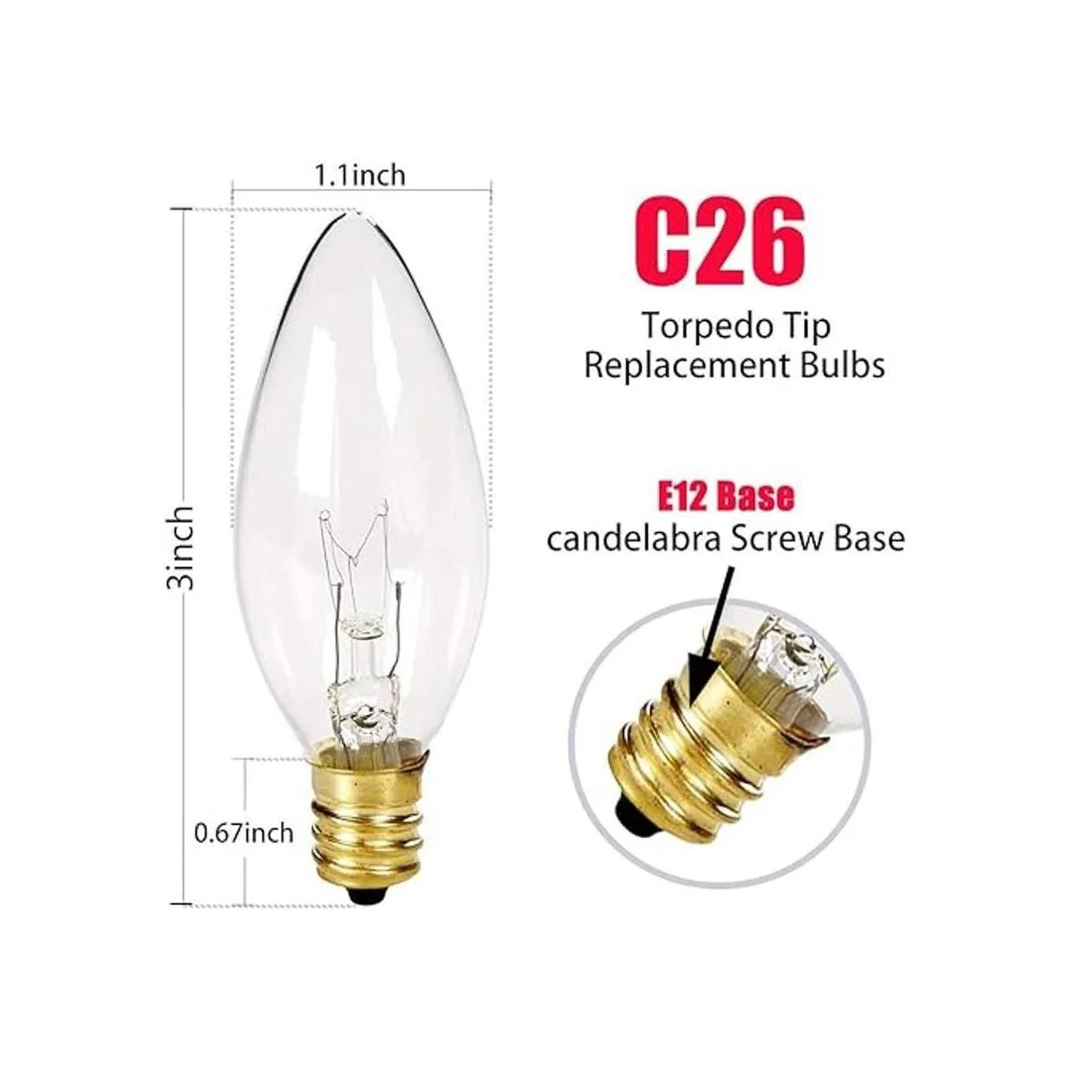 Paquete de 25 bombillas de noche C26 de cristal transparente con punta de torpedo, 7 W por cada bombilla, 120 voltios de potencia.