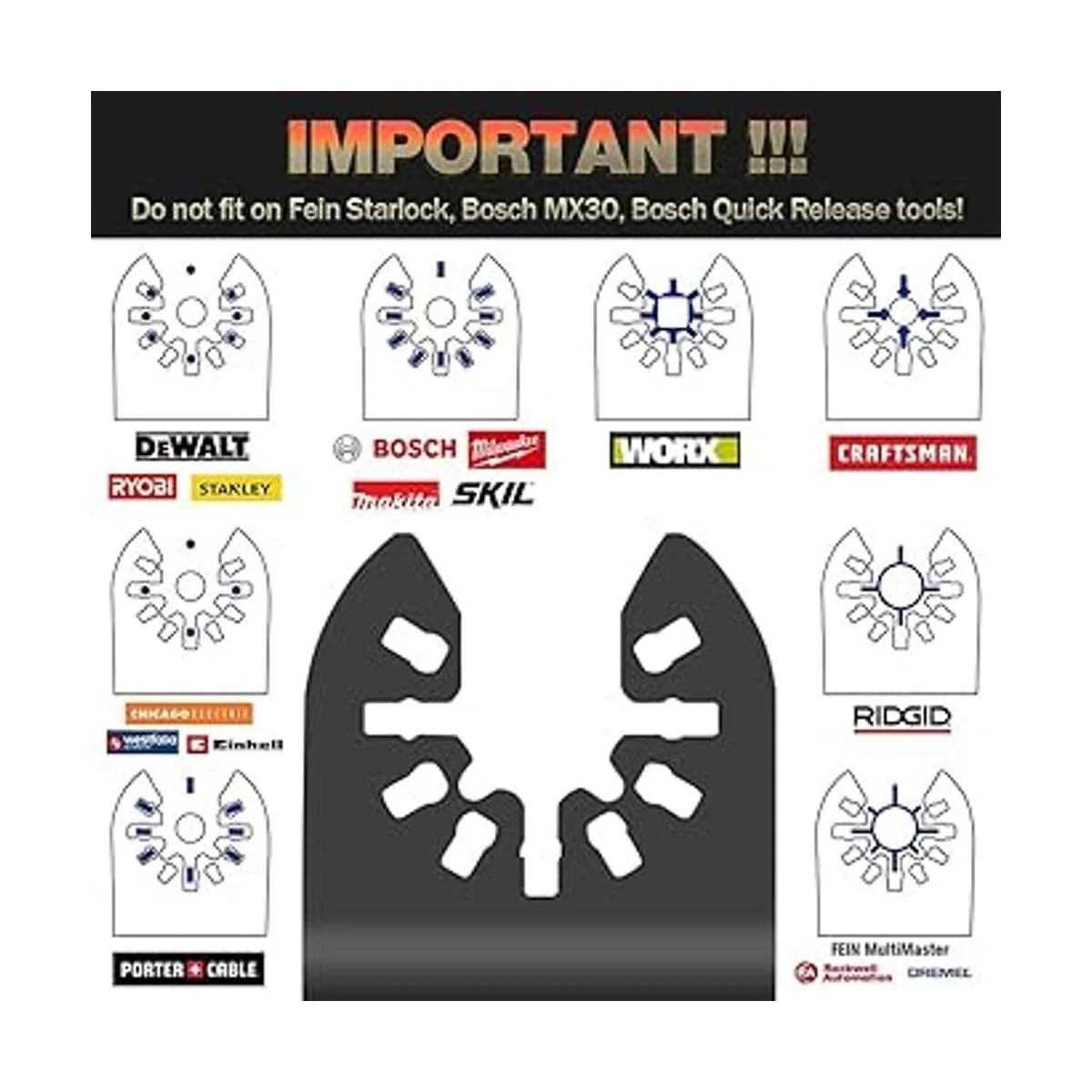 Sistema de interfaz universal: nuestras 25 hojas de sierra de liberación rápida son perfectamente compatibles con más del 95 de las herramientas oscilantes del mercado, como Fein Multimaster, Ryobi, Milwaukee, Hitachi, Black Decker, Chicago Electric, Dewalt, Craftsman y otros. No es compatible con herramientas Bosch de liberación rápida: no es compatible con Fein Starlock, Bosch MX30; adaptador necesario para Fein Supercut; adaptador necesario para Dremel MM40 y MM45. 2 adaptadores adicionales de clip en C para adaptarse a más modelos
