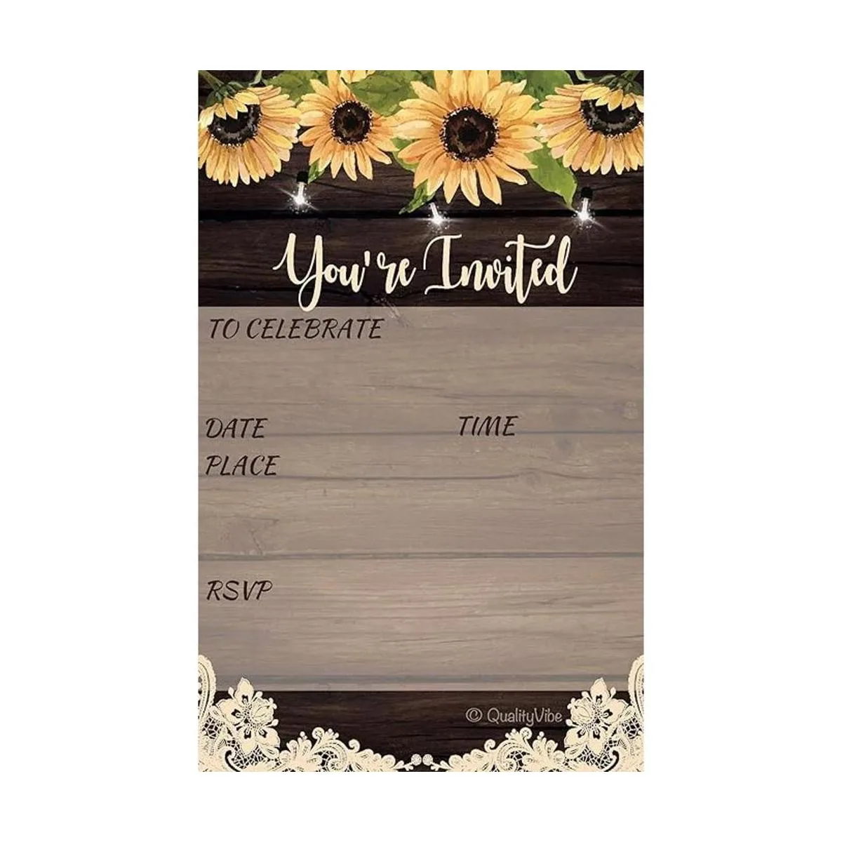 Invitación de relleno: girasol con encaje rústico para varias opciones de eventos como bodas, despedidas de soltera, baby shower, graduaciones y cualquier evento especial. Invitación: invitación temática rústica para varios eventos como bodas, despedidas de soltera, baby shower, graduaciones y cualquier evento especial.