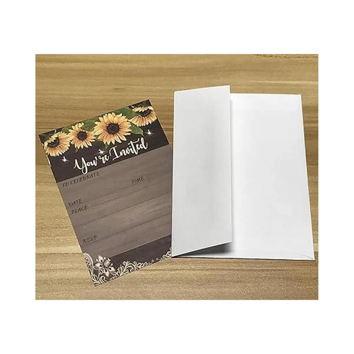25 invitaciones de girasol, madera rústica y encaje con 25 sobres para bodas, despedidas de soltera, cumpleaños, inauguración de la casa, jubilación, compromisos y mucho más eventos.