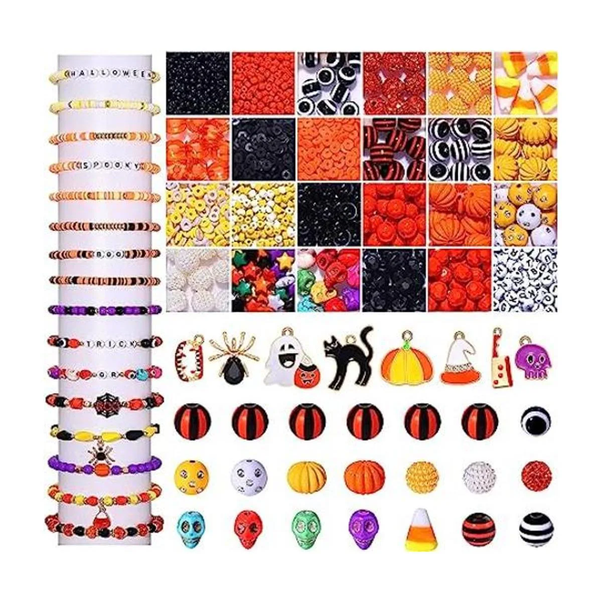 Kit de fabricación de joyas de Halloween: recibirás 2510 cuentas sueltas que incluyen 960 cuentas de arcilla polimérica en 4 colores, 1200 cuentas pequeñas de 0.157 in en 4 colores, 30 cuentas de estrella, 100 cuentas de acrílico naranja y negro, 20 cuentas de calabaza, 24 cuentas de tira, 10 cuentas de calavera, 5 cuentas de maíz, 21 cuentas de maíz de diamantes de diamantes de diamantes de imitación, 1000 cuentas de letras, etc. Y 8 dijes esmaltados de Halloween. Cantidad suficiente y estilos pueden satisfacer fácilmente tus necesidades de bricolaje de Halloween