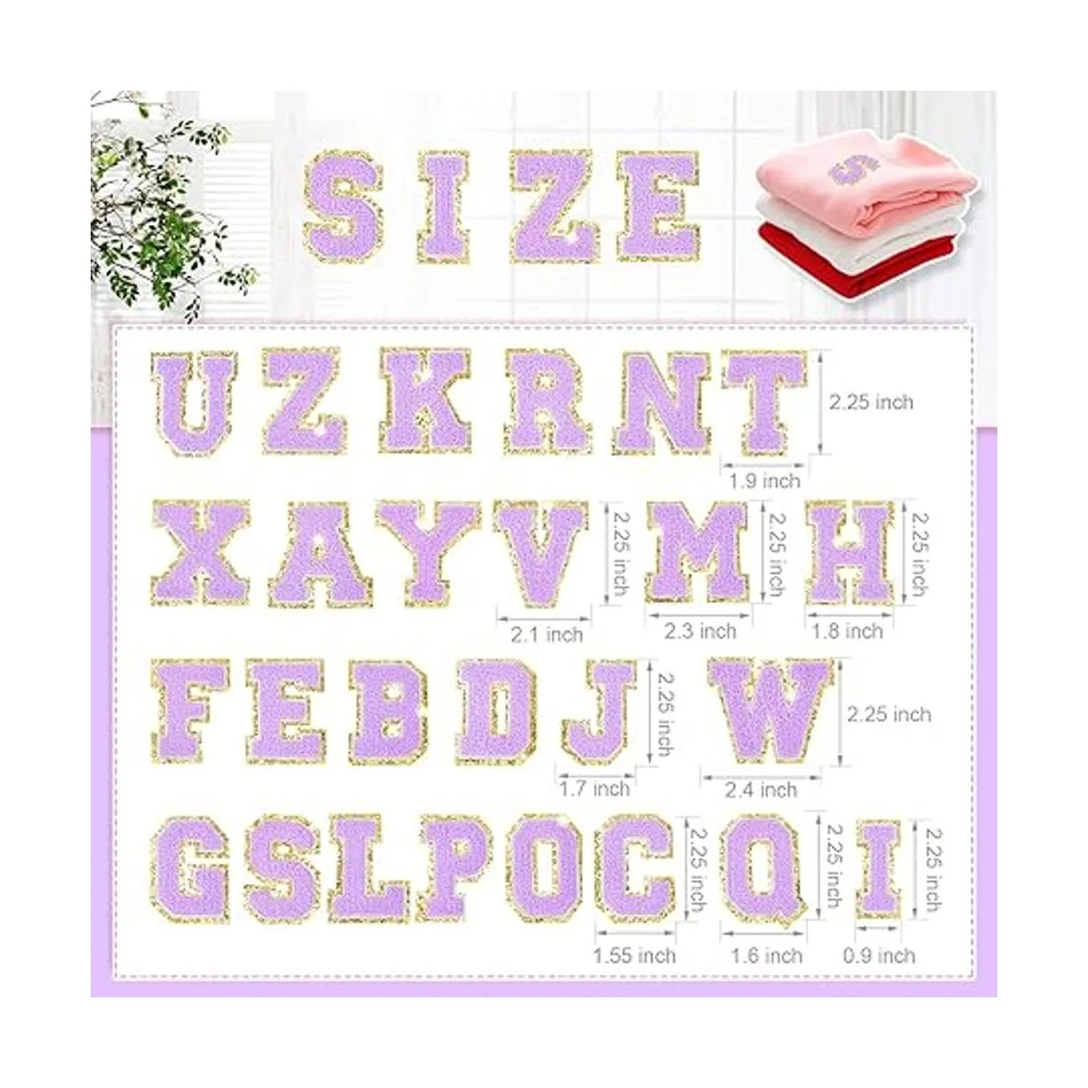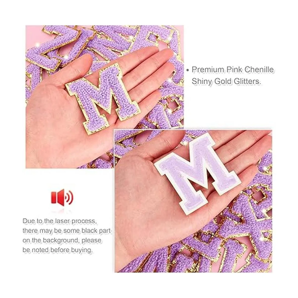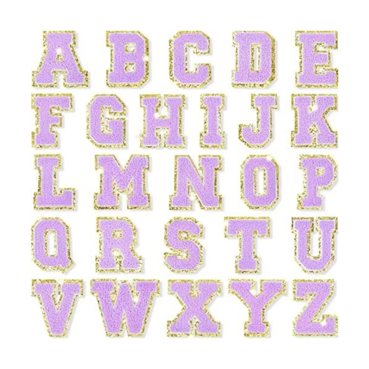 26 parches de brillantina para planchar con letras de chenilla AZ, parches bordados para reparación de ropa, sombreros, camisas, zapatos, bolsas de jeans dorado, morado