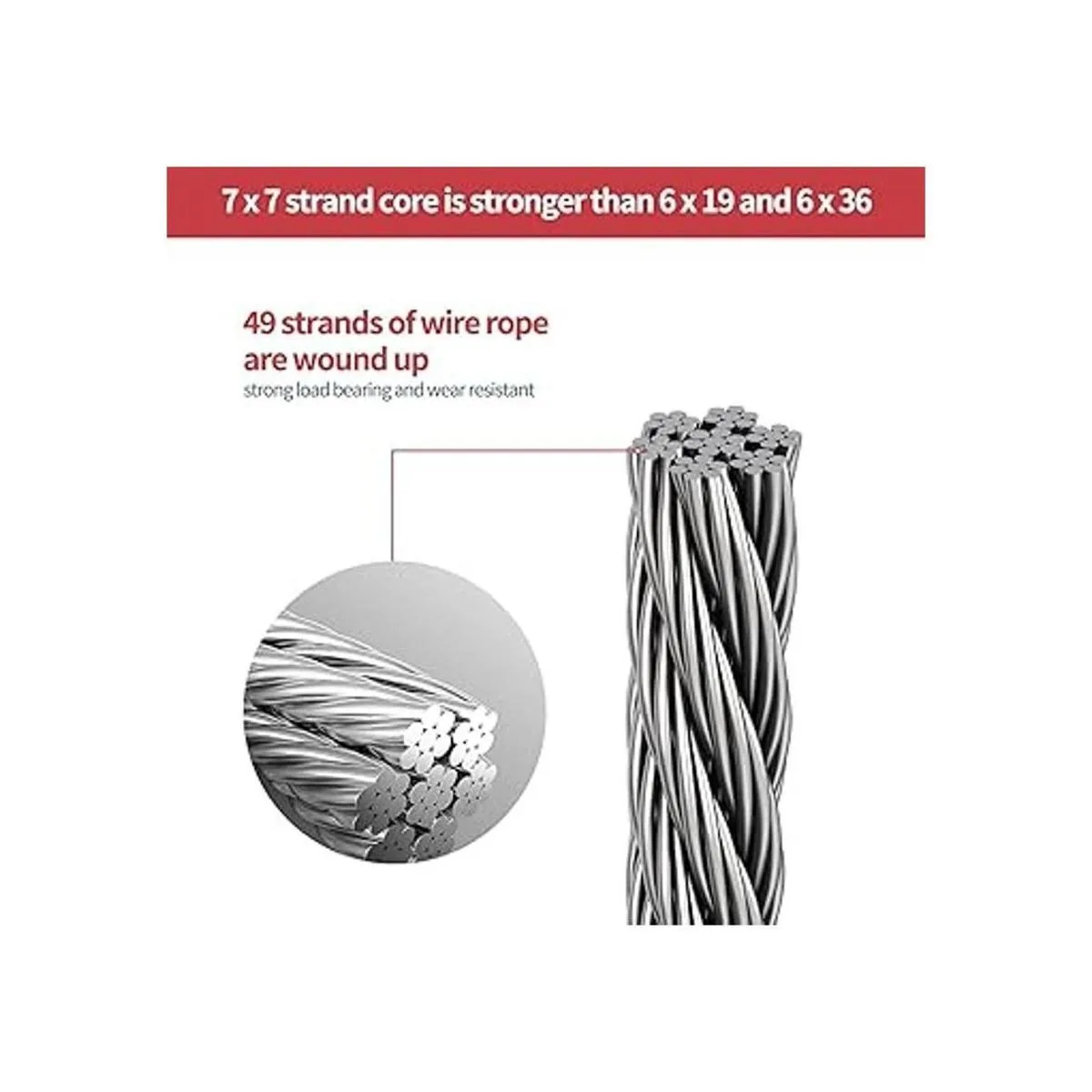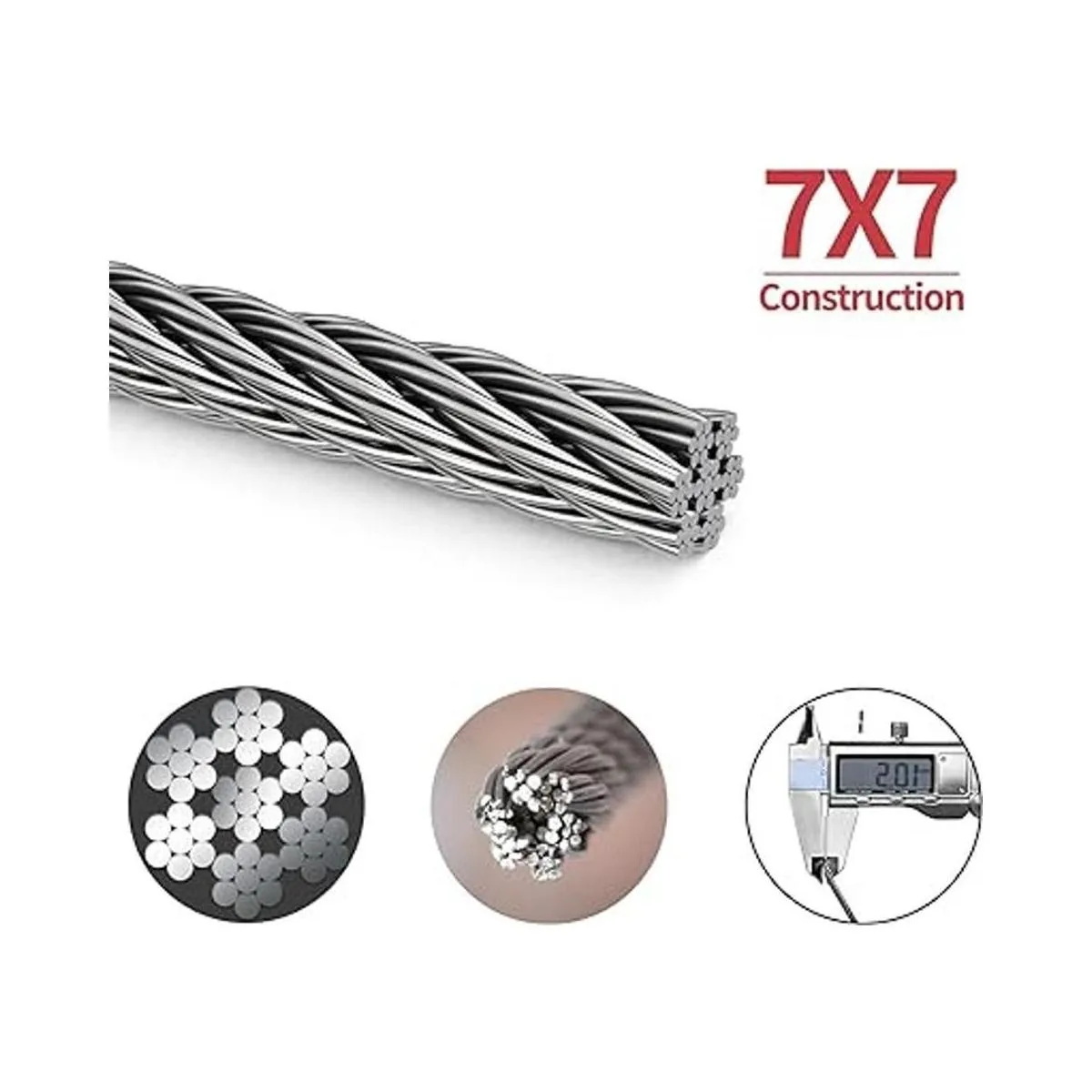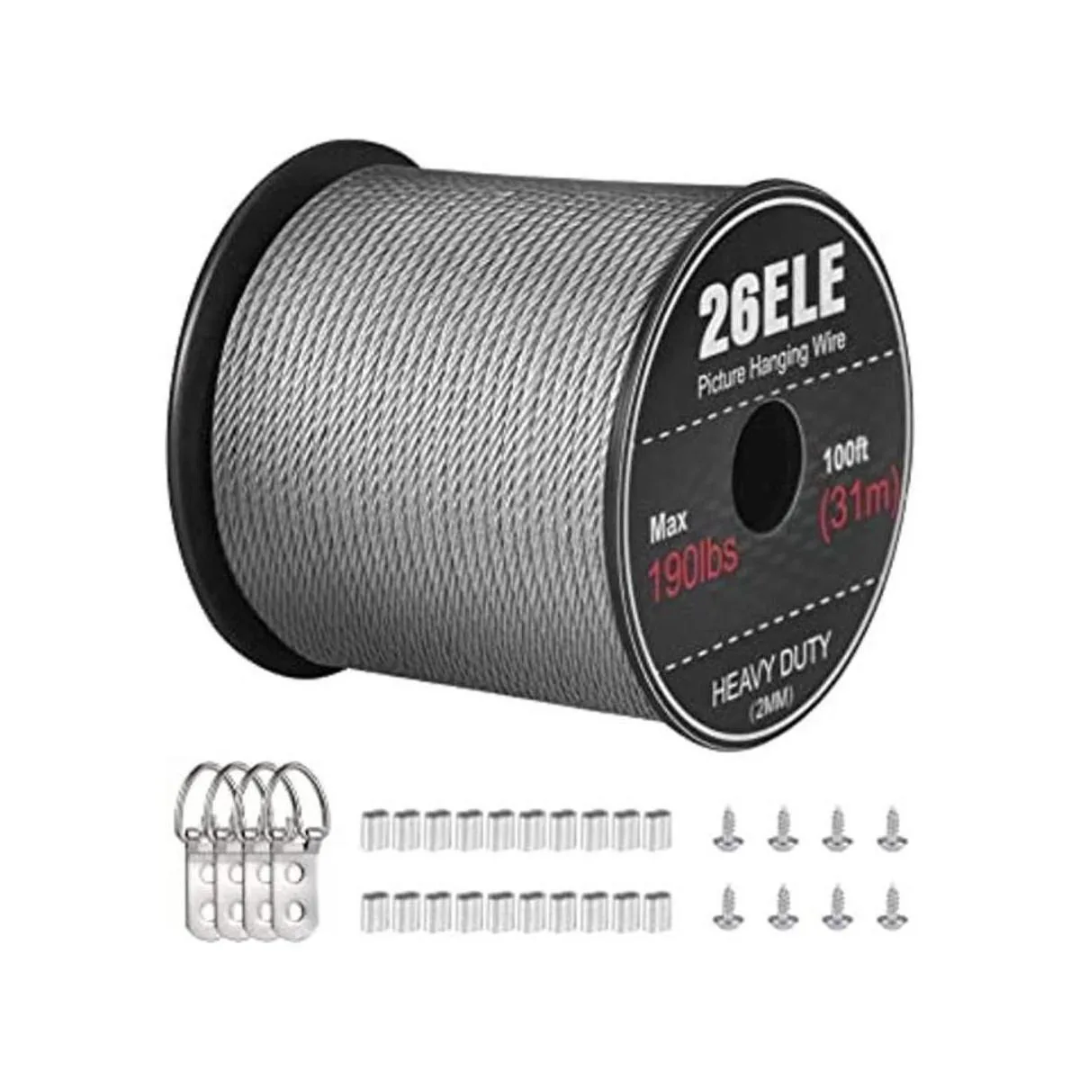 26ELE Alambre para colgar fotos de 190 libras, resistente cuerda de alambre de acero inoxidable para colgar marcos de fotos y arte de pared, alambre de metal fuerte de 98.4 ft con 20 fundas de crimpado, 4 anillos D y 8 tornillos