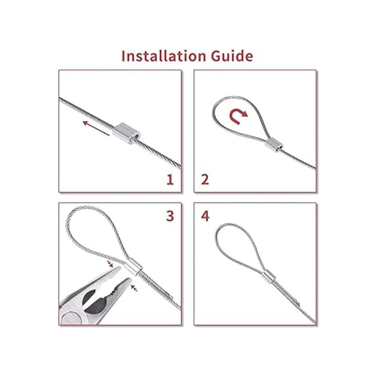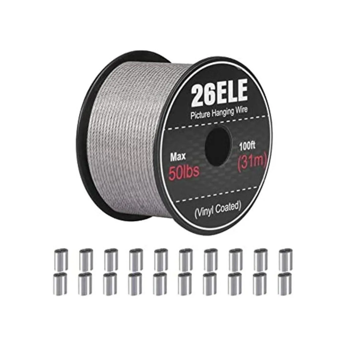26ELE Alambre para colgar fotos de 50 libras, resistente cuerda de alambre de acero inoxidable para colgar marcos de fotos y arte de pared, alambre de metal fuerte de 98.4 ft con 20 fundas de aluminio para crimpar