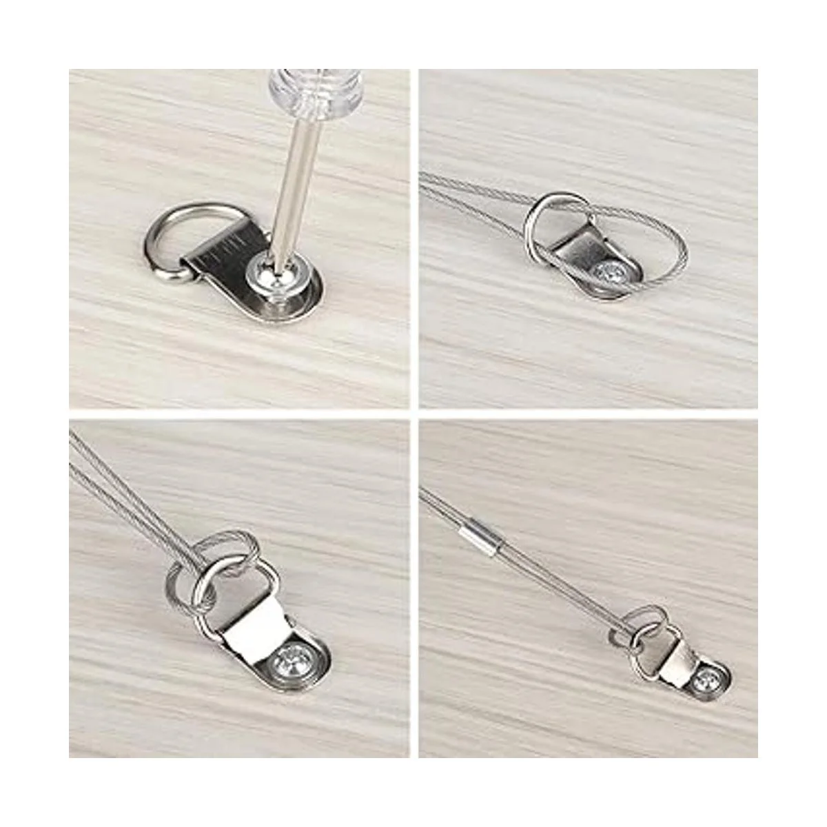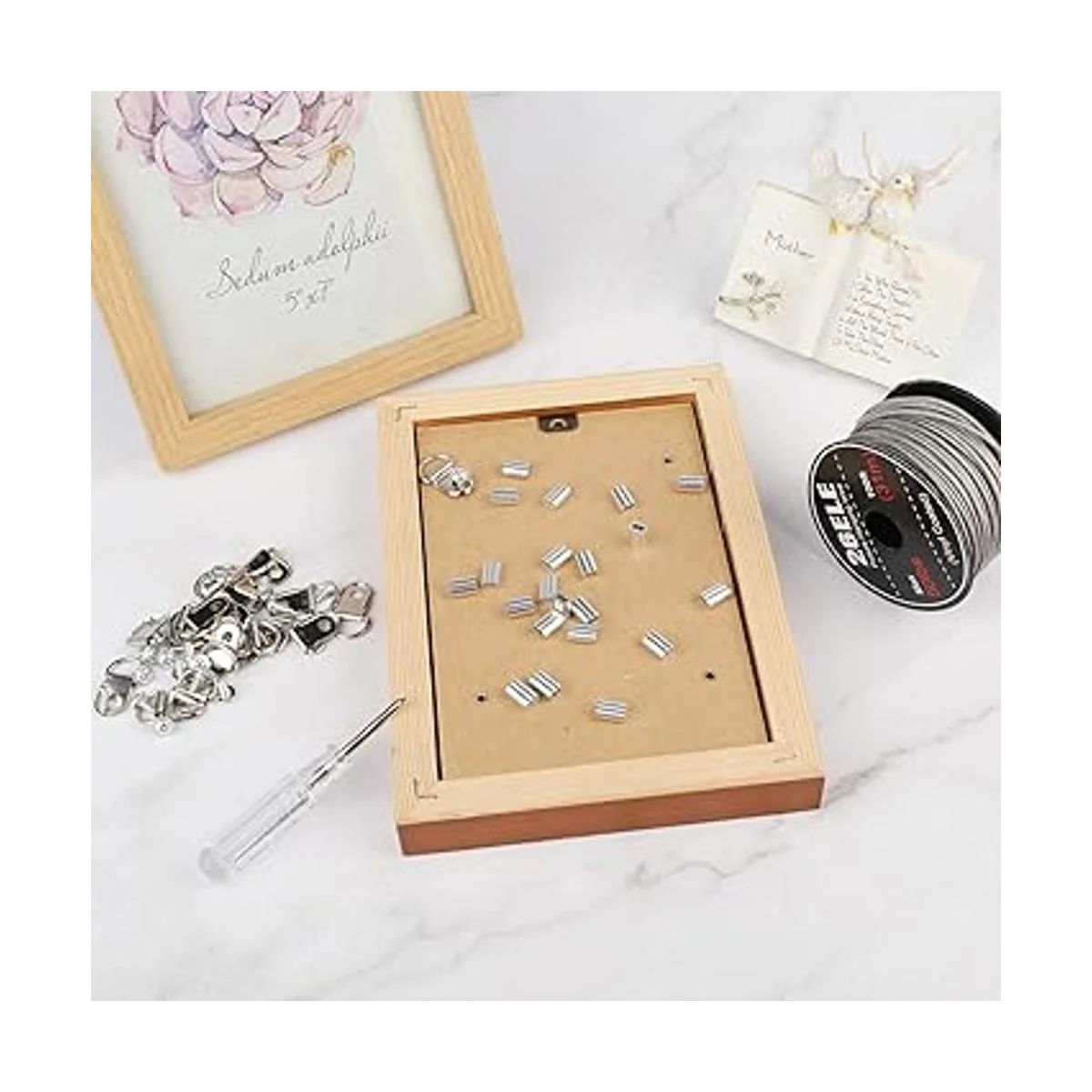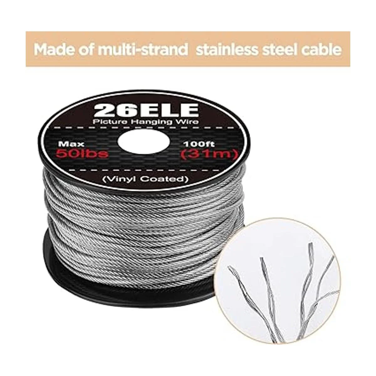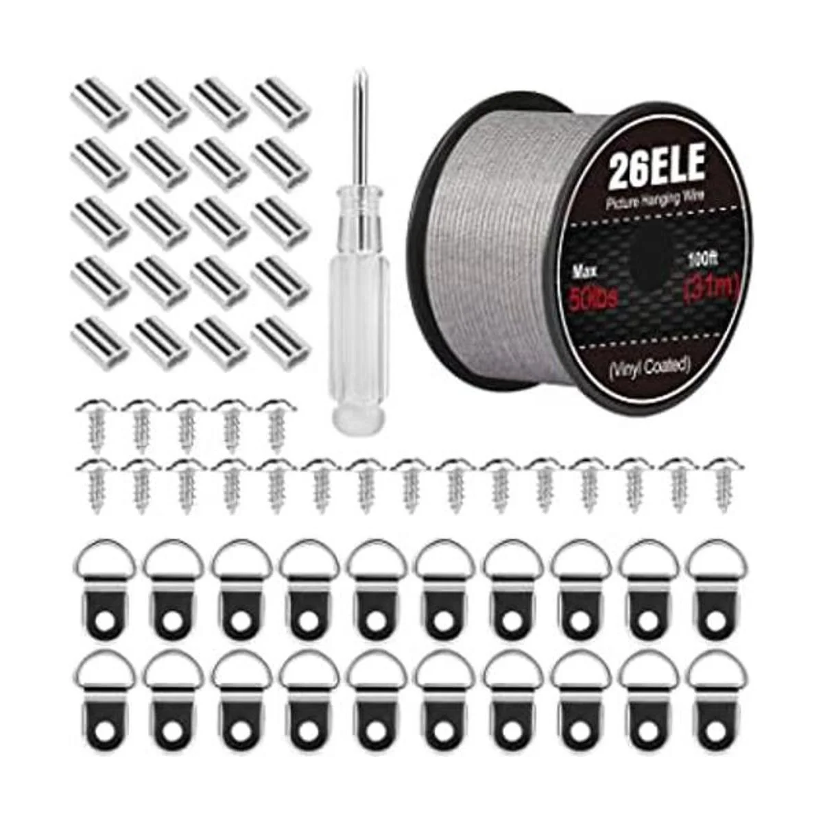 26ELE Kit para colgar fotos, incluye alambre para colgar fotos 100 pies, soporta hasta 50 libras, ganchos y tornillos de anillo en D 20 piezas cada uno, 20 fundas de crimpado de aluminio y 1 destornillador