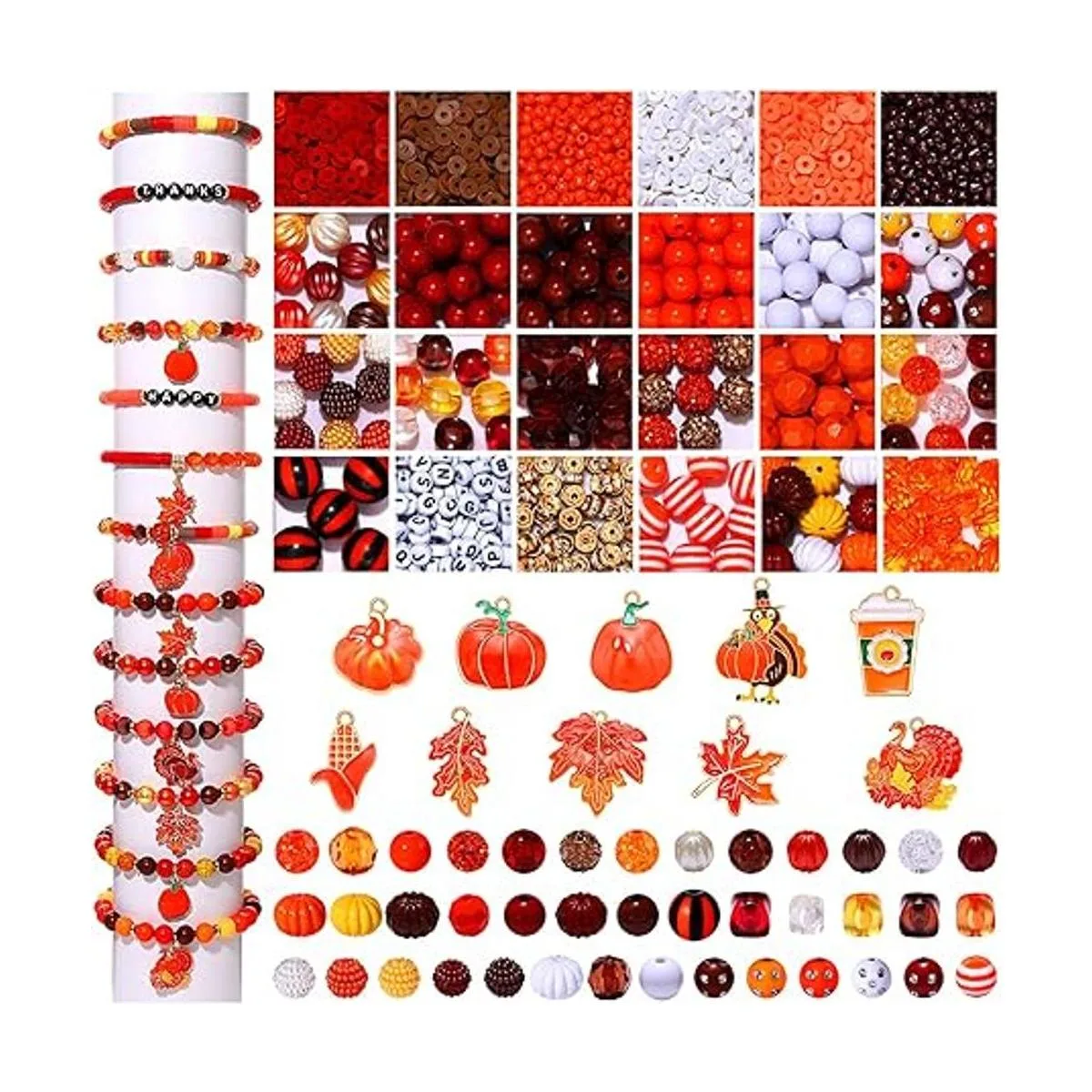 Todo lo que necesitas está incluido: recibirás todo lo que necesitas para hacer joyas de otoño con nuestro kit de abalorios de cuentas. Incluye más de 2800 cuentas sueltas de color naranja y marrón contiene 1280 cuentas de arcilla polimérica en 4 colores, 1200 cuentas de pony, 125 cuentas acrílicas, 20 cuentas de calabaza, 10 cuentas de vidrio agrietado, 15 cuentas de tira, 10 cuentas espaciadoras; 10 dijes de otoño contienen calabaza, hoja de arce, pavo, maíz, taza, etc.