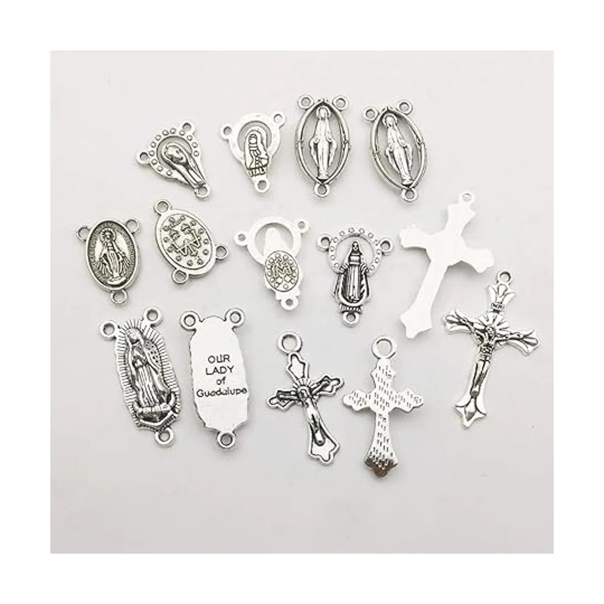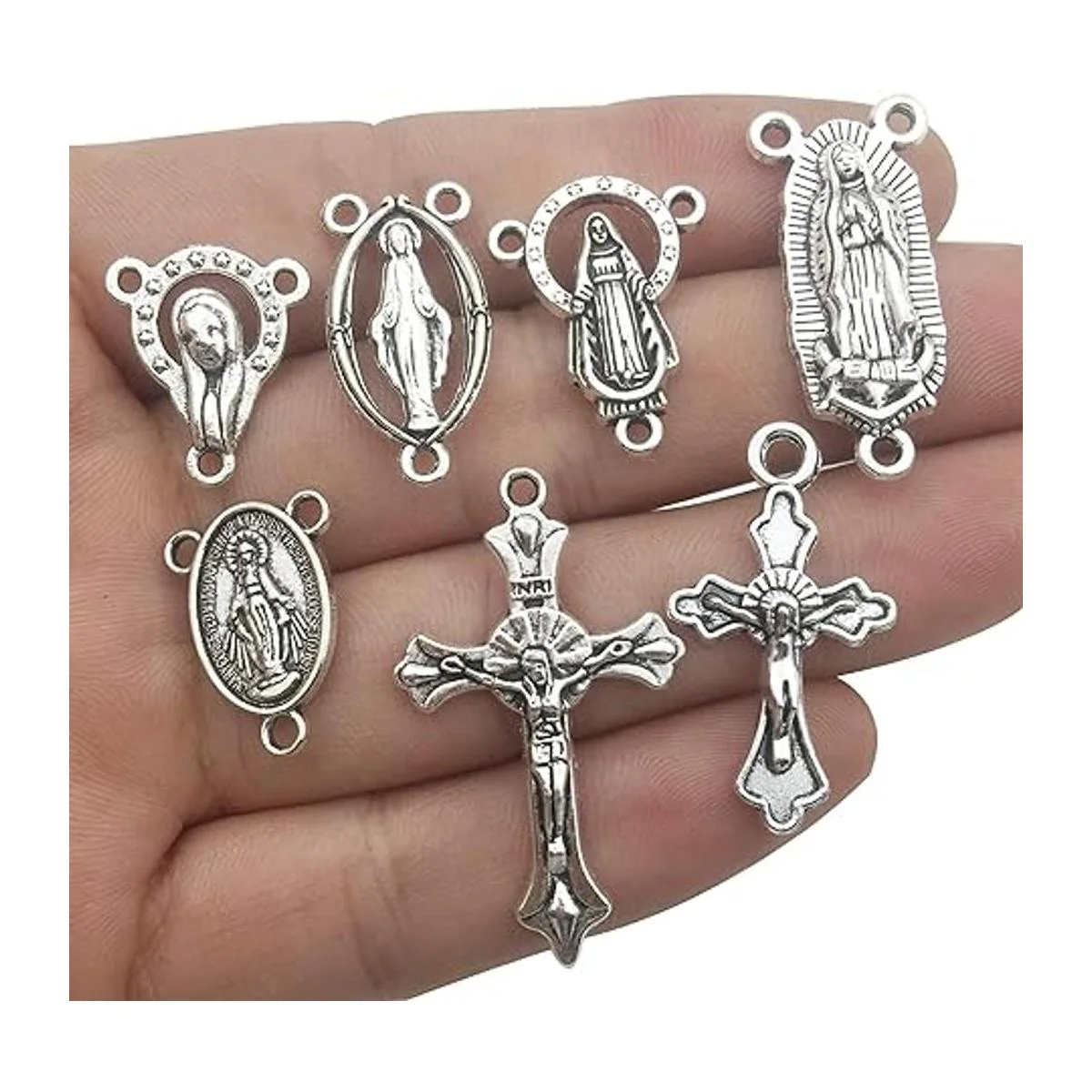 3.53 oz 60 piezas cruz de plata antigua Jesús María, Nuestra Señora, centro de mesa milagroso, dije de medalla de crucifijo para manualidades, accesorios de fabricación de joyas para rosario, collar pulsera M154