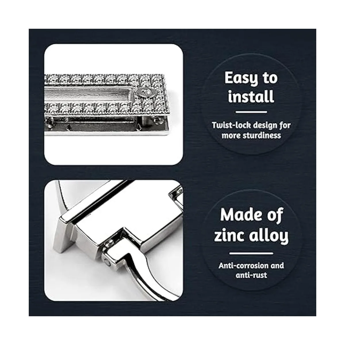 Fácil de instalar: de acuerdo con las especificaciones reales de espaciado de agujeros del producto, cada cerradura de cartera se compone de 4 piezas. Ajusta el tamaño y los agujeros, y luego presiona.