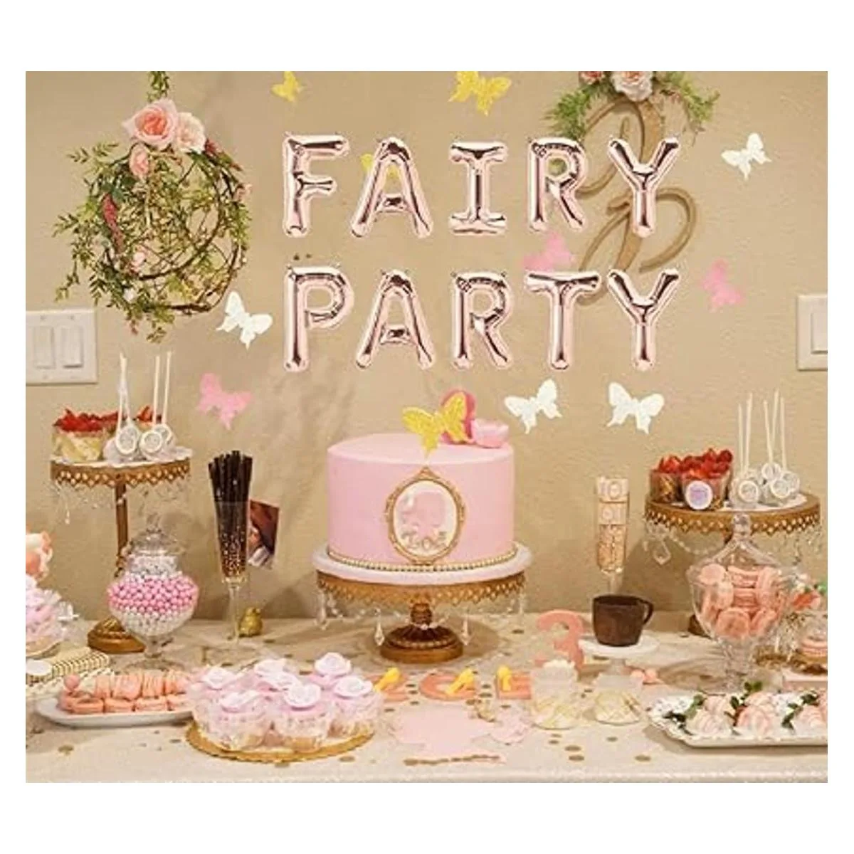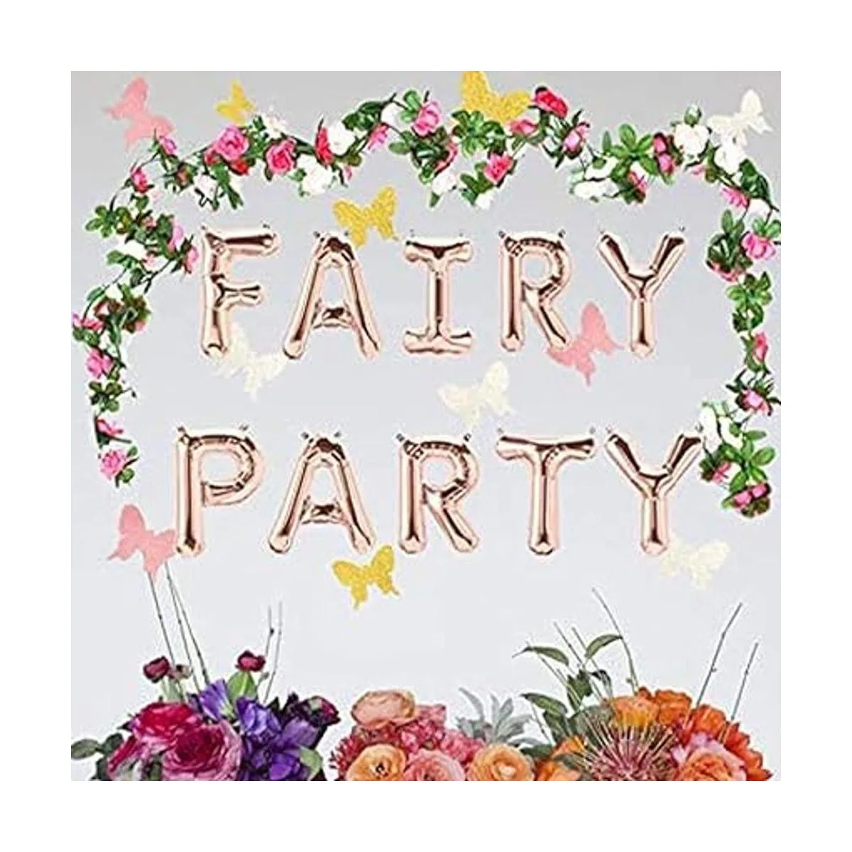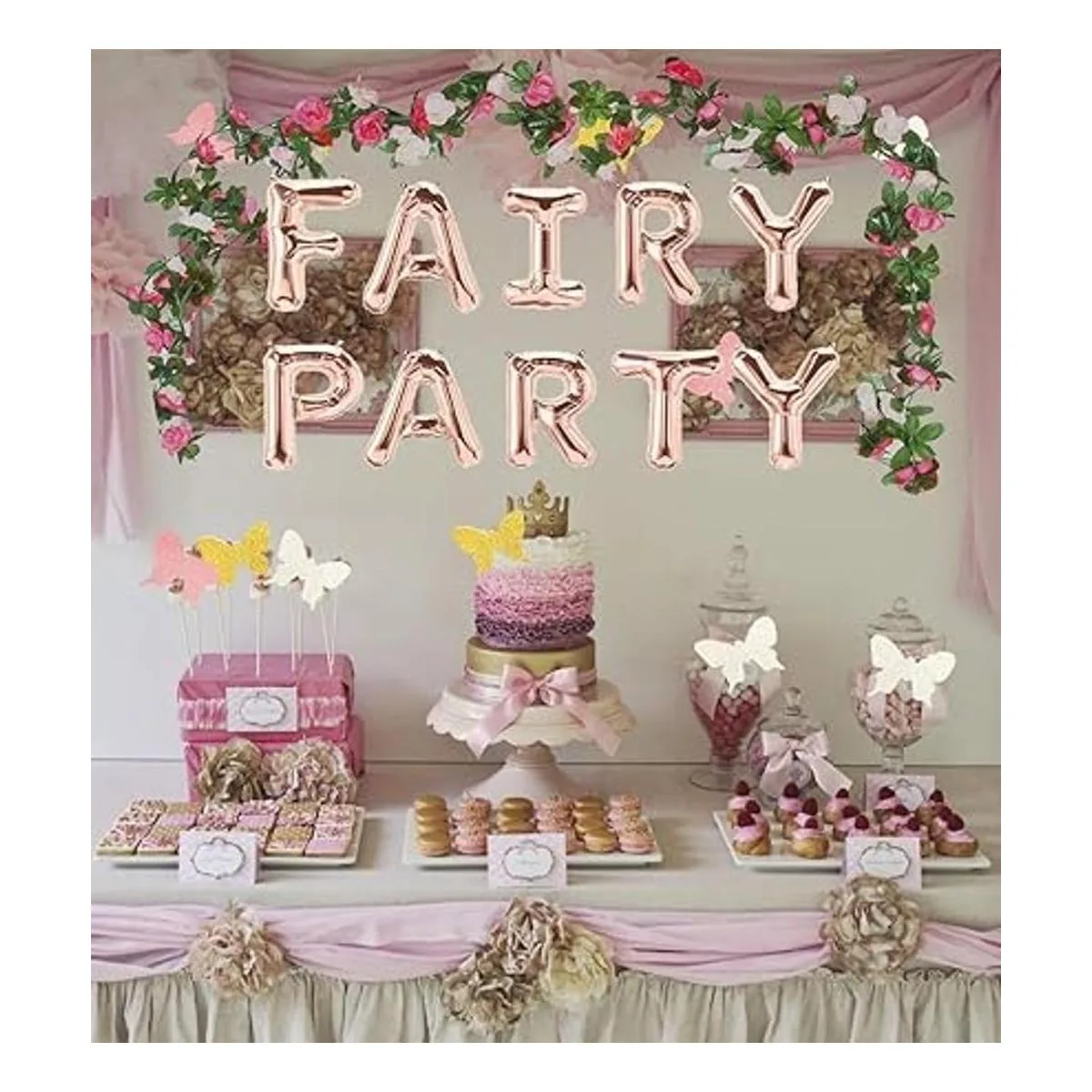 Globos llenos de aire. Los globos de letras no flotarán cuando se llenan de helio. El paquete incluye: 1 globo de letras de 16 pulgadas, 1 guirnalda de rosa, 1 guirnalda de mariposas.