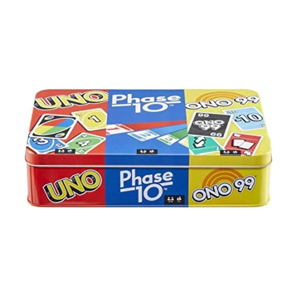 En esta exclusiva lata llena de diversión, los amantes de las cartas encontrarán 3 emocionantes juegos de Mattel: el juego de cartas UNO, el juego de cartas Phase 10 y el juego de cartas ONO 99. Cada baraja ofrece un juego único para una experiencia diferente: