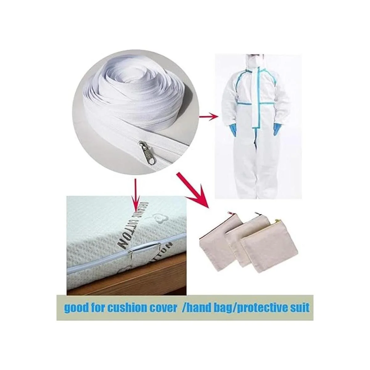 La cremallera por el patio se puede utilizar ampliamente para coser tapicería o ropa, bolsos, bolsos, vestidos, faldas, bolsas protectoras de almacenamiento de ropa de almohada, funda de cojín, cojín de asiento trasero, manualidades, bolsos, etc