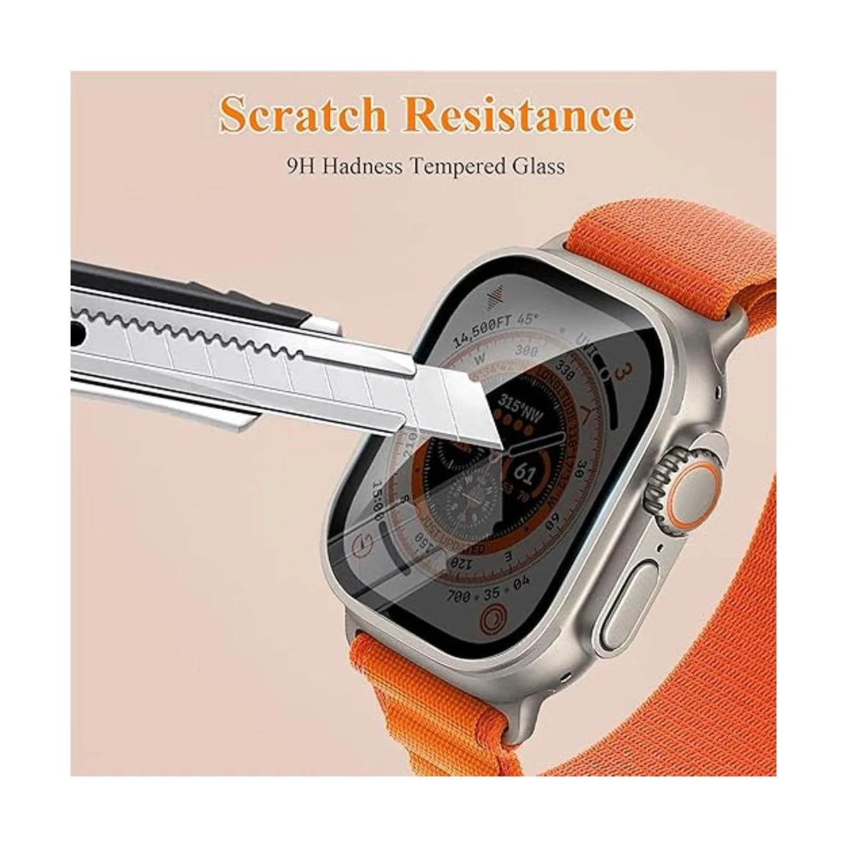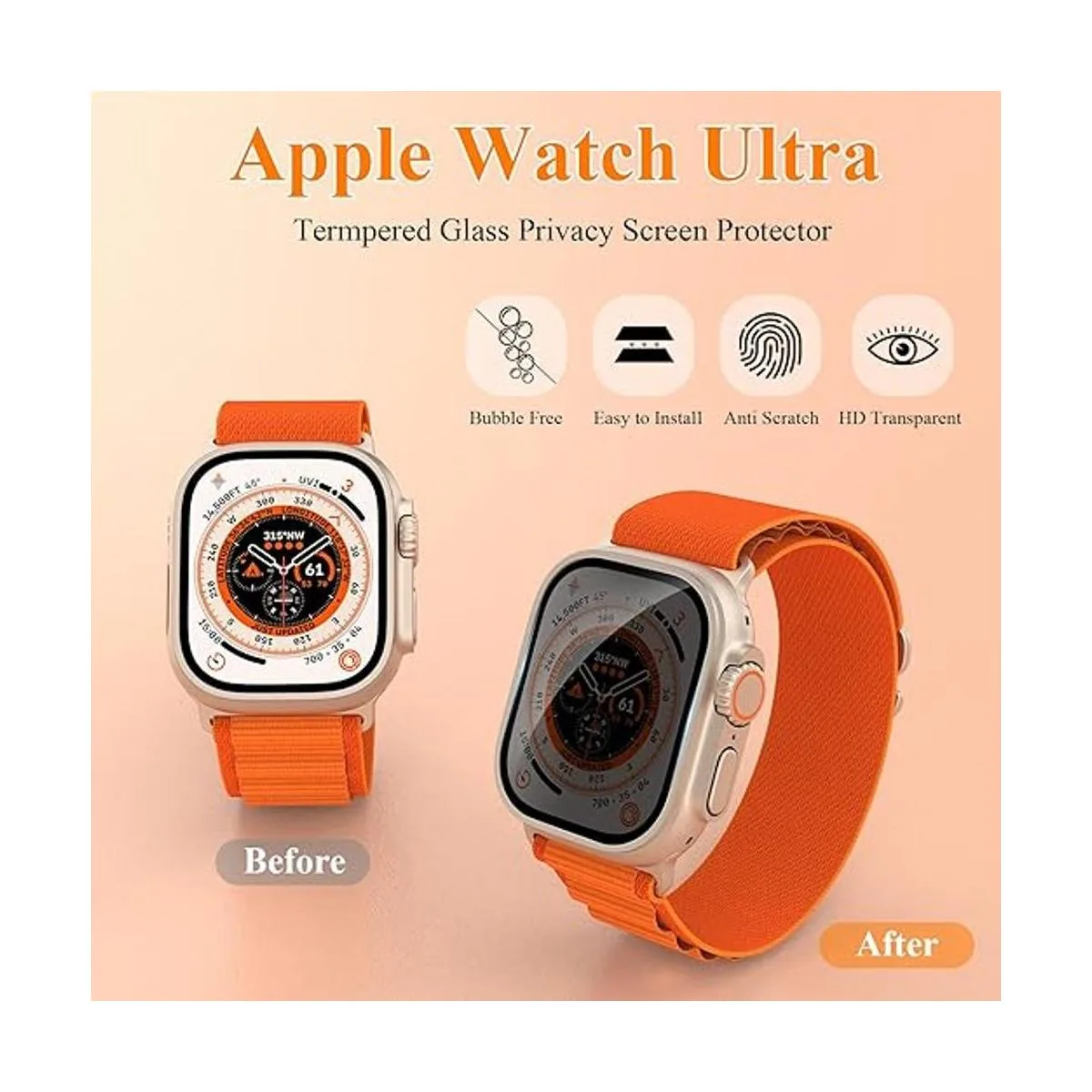AntiScratch: Screen protector is made of militarygrade 9H hardness tempered glass, which can protector your Apple Watch Ultra from scratch and daily wear. Screen surface with olephobic coating can waterproof and Antioil, antifignerprint.