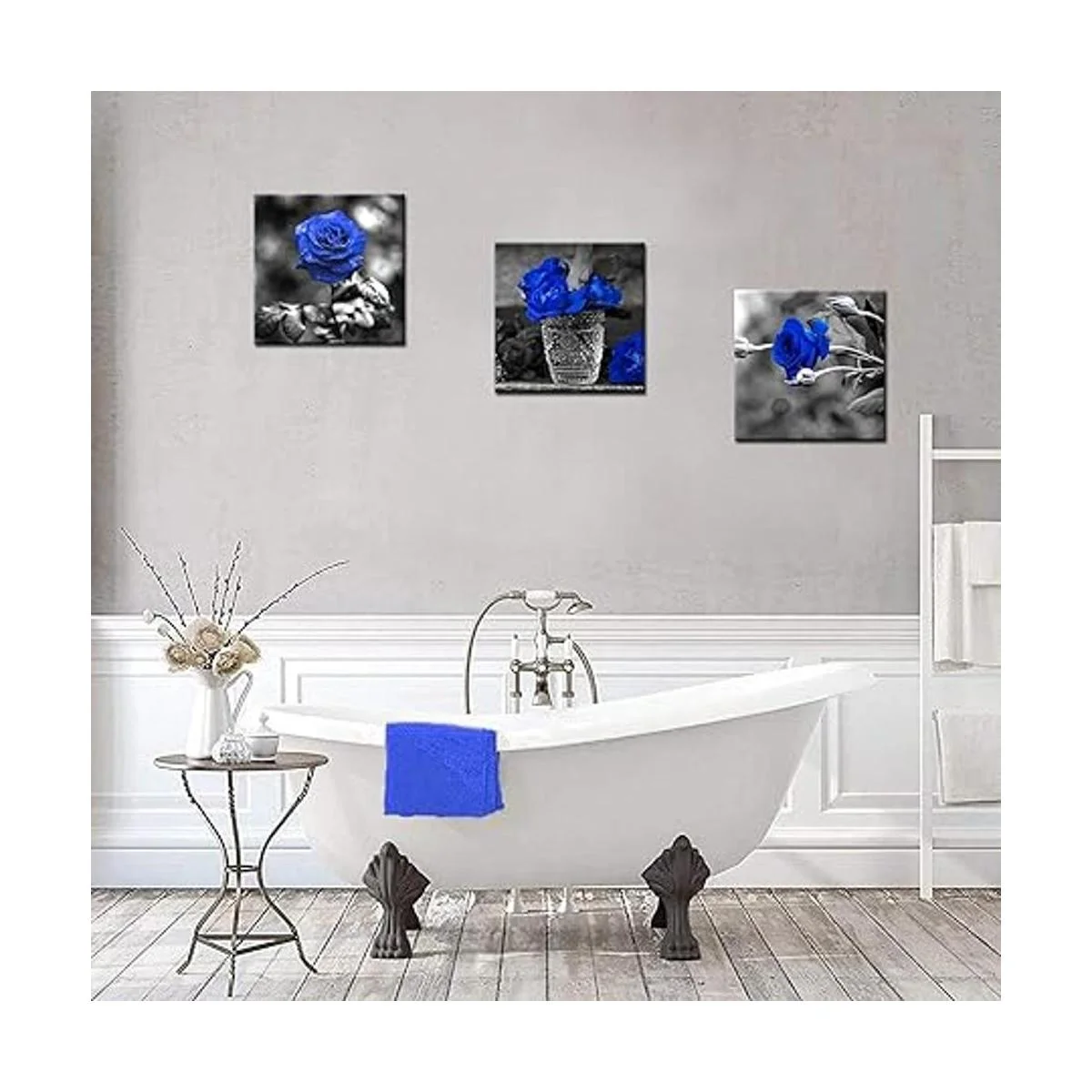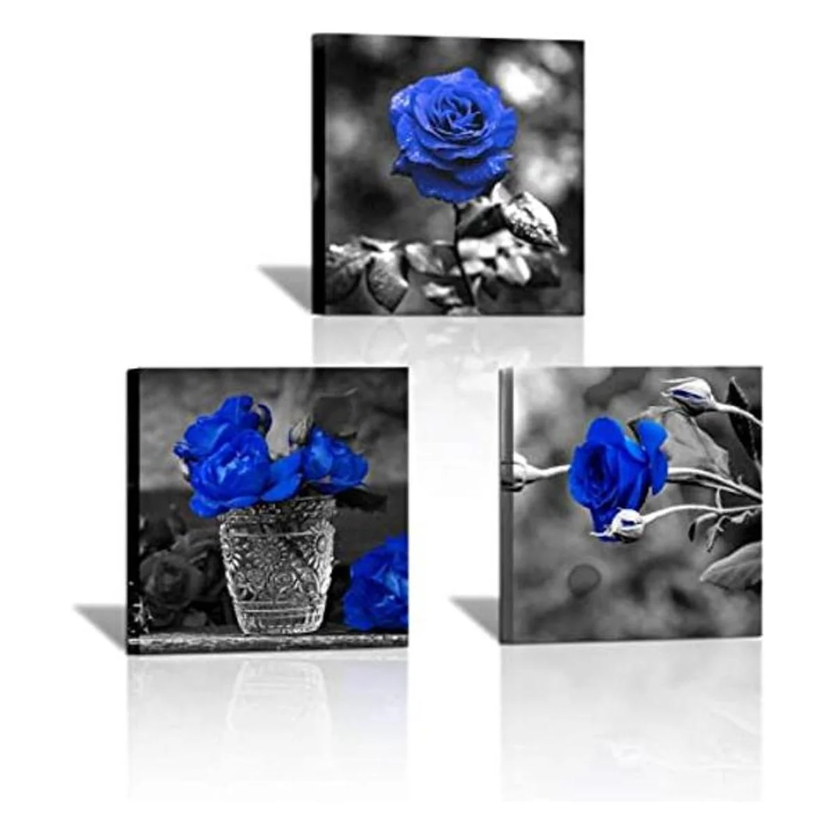 3 paneles de lienzo de rosa azul, arte de pared con flores blancas y negras, cuadro floral azul real, listo para colgar, para baño, dormitorio, cocina, decoración de pared, 12 x 16 x 3 piezas