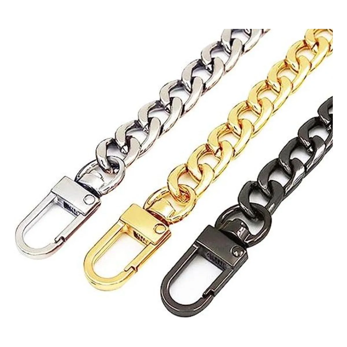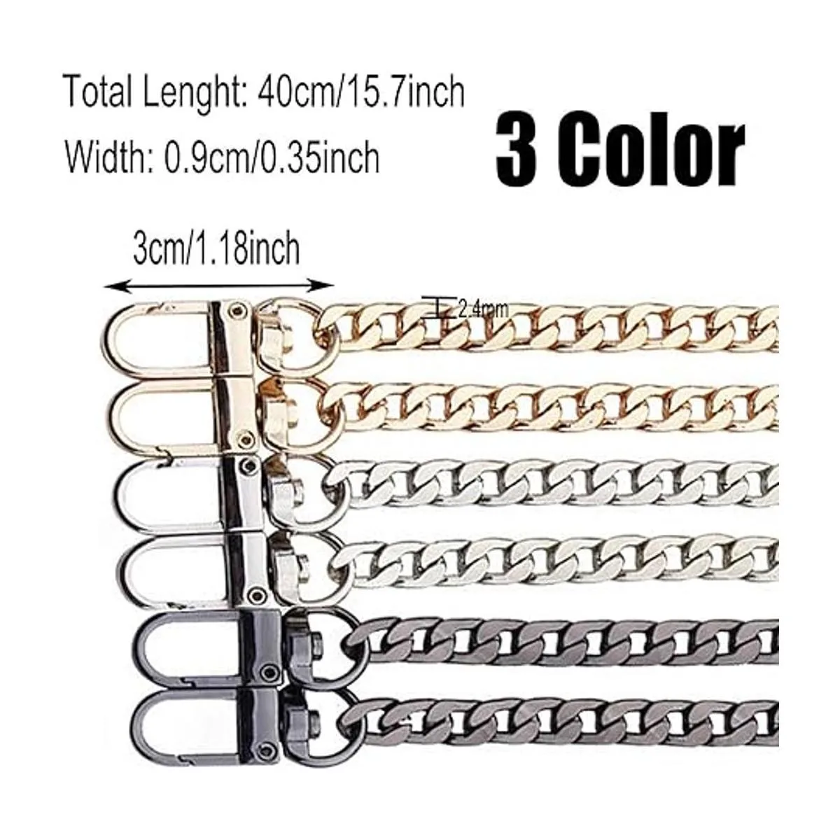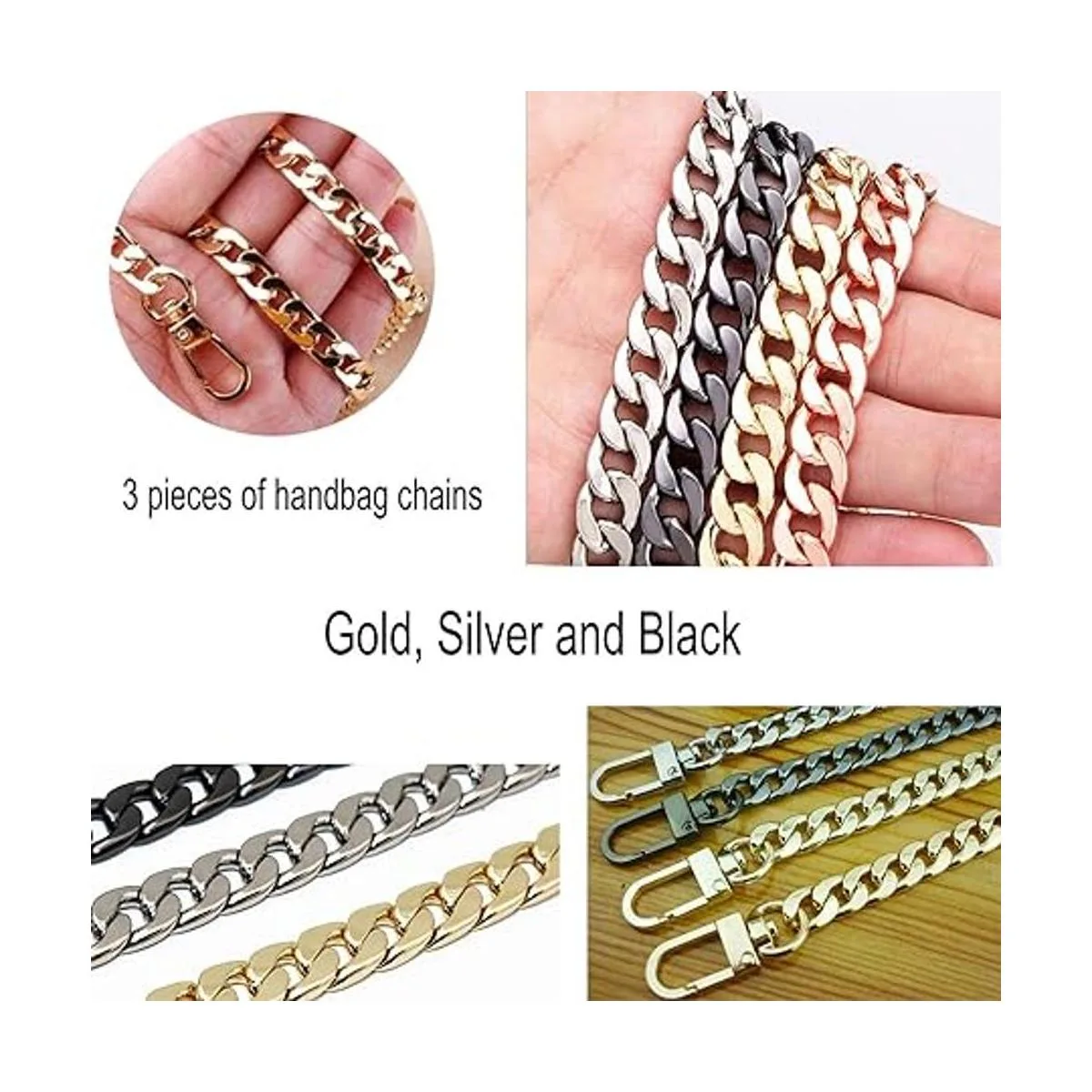 El paquete incluye: 3 cadenas de bolso en 3 colores, oro, plata y negro