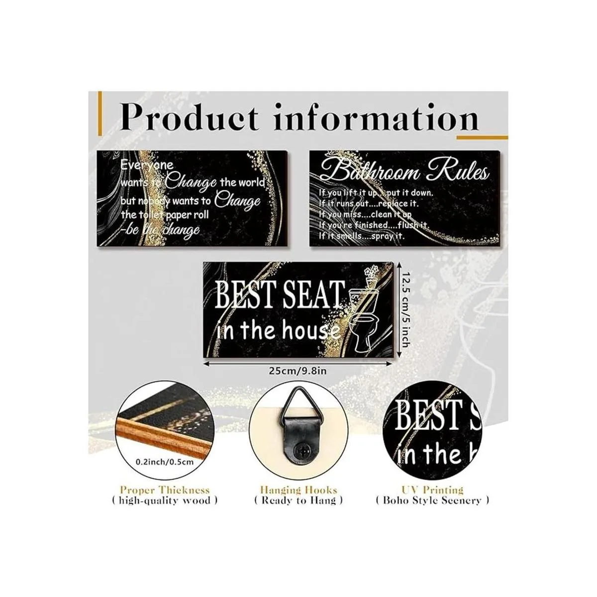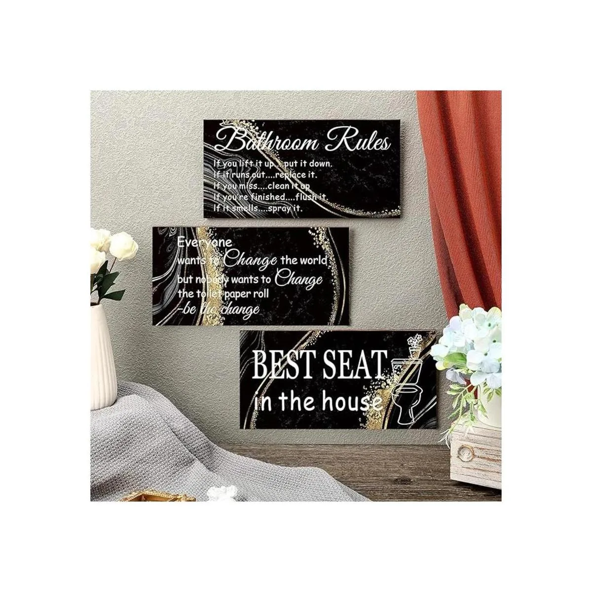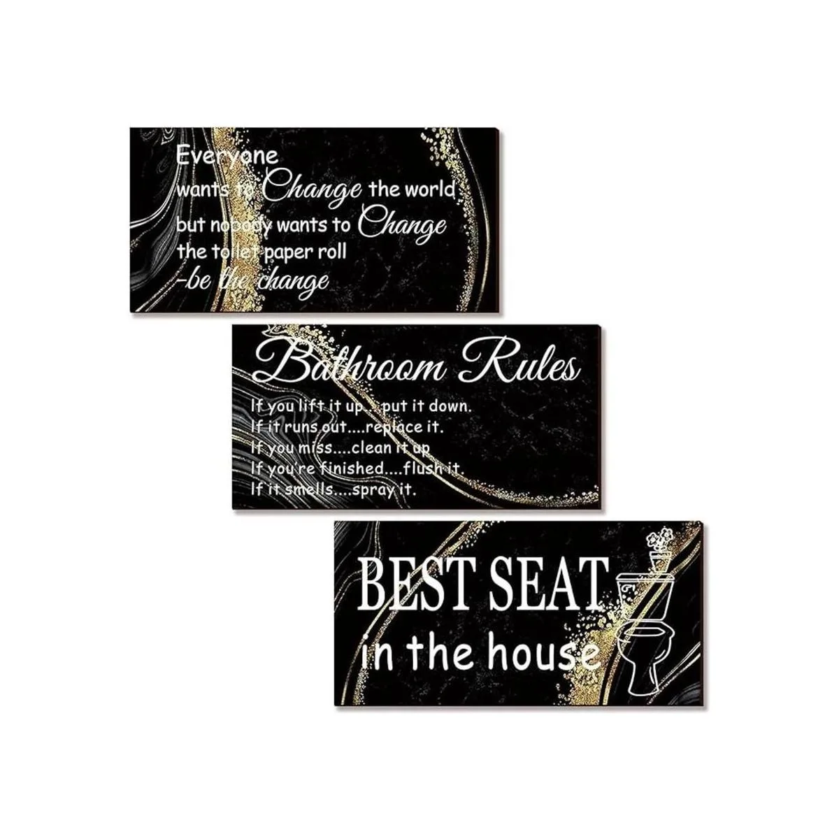 3 piezas de decoración de pared de baño negro y dorado, divertidas reglas de baño, arte de pared, el mejor asiento de la casa, decoración de pared para baño e inodoro