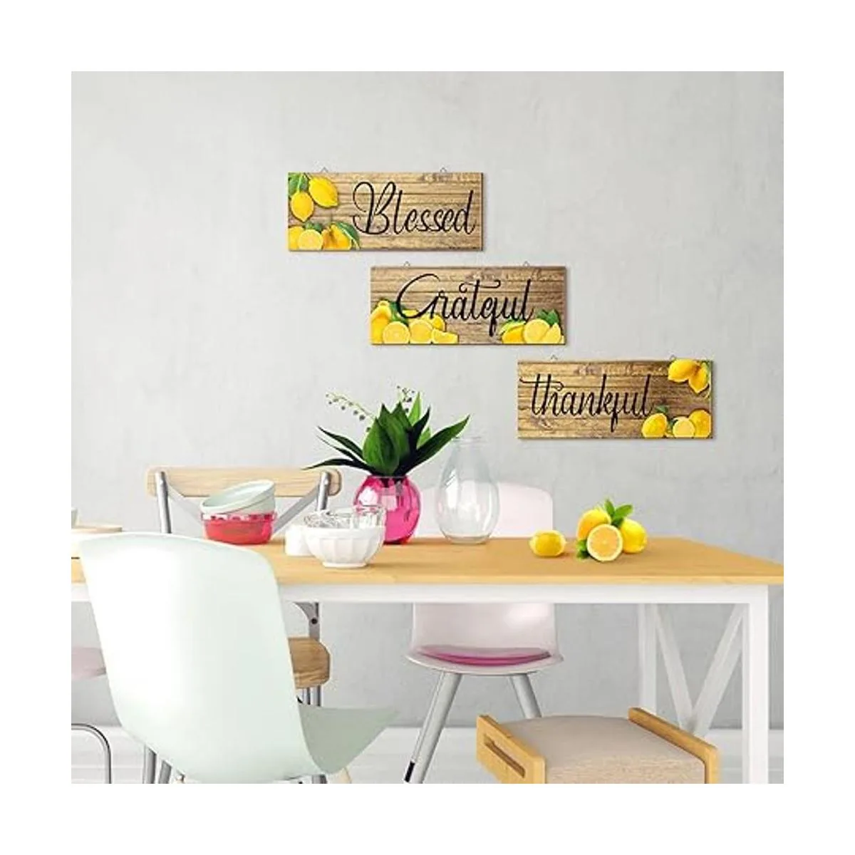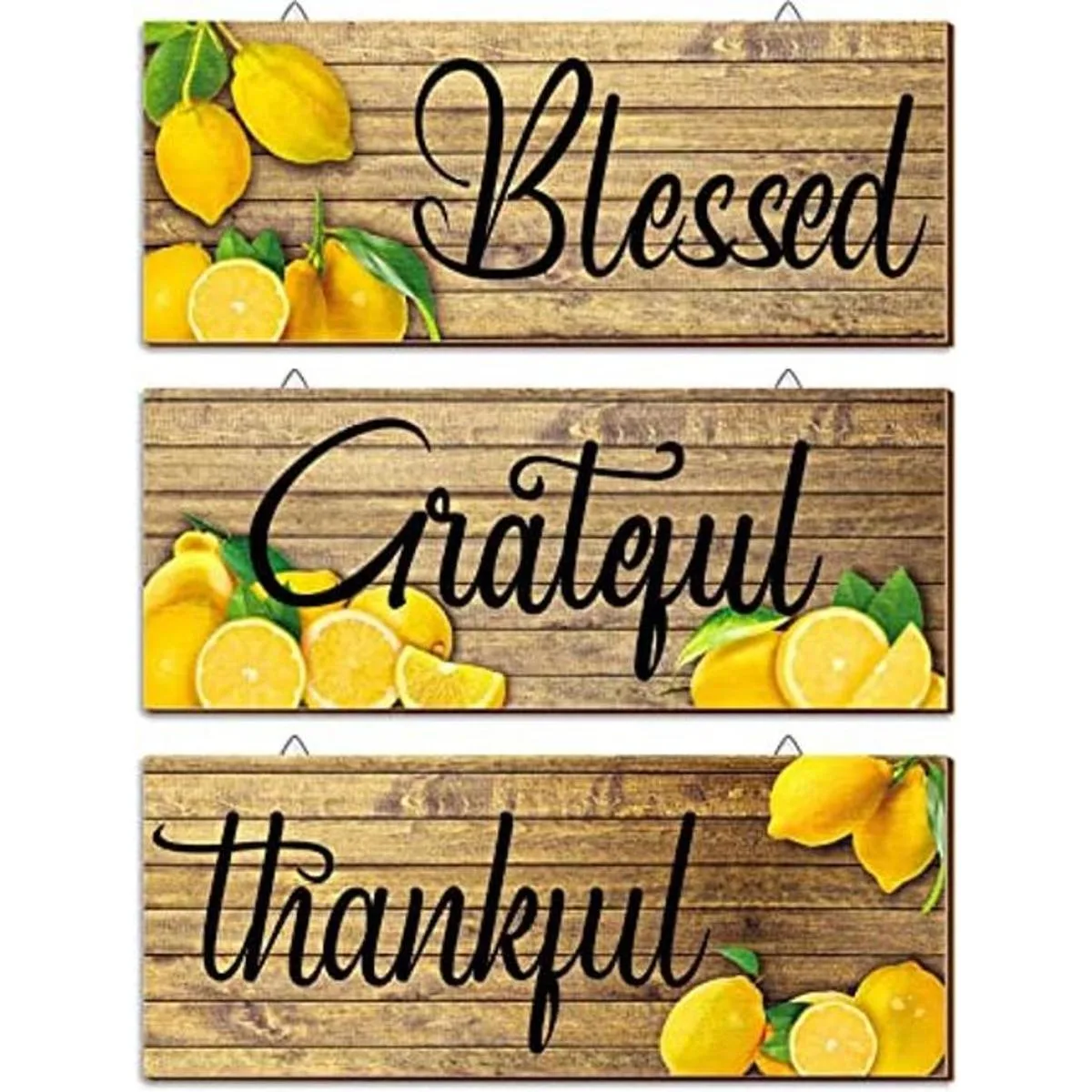 3 piezas de decoración de pared de limón con texto en inglés Grateful Thankful Bless para decoración de pared del hogar, letreros de pared para puerta delantera, casa de campo, para decoración de pared, cocina y sala de estar color madera