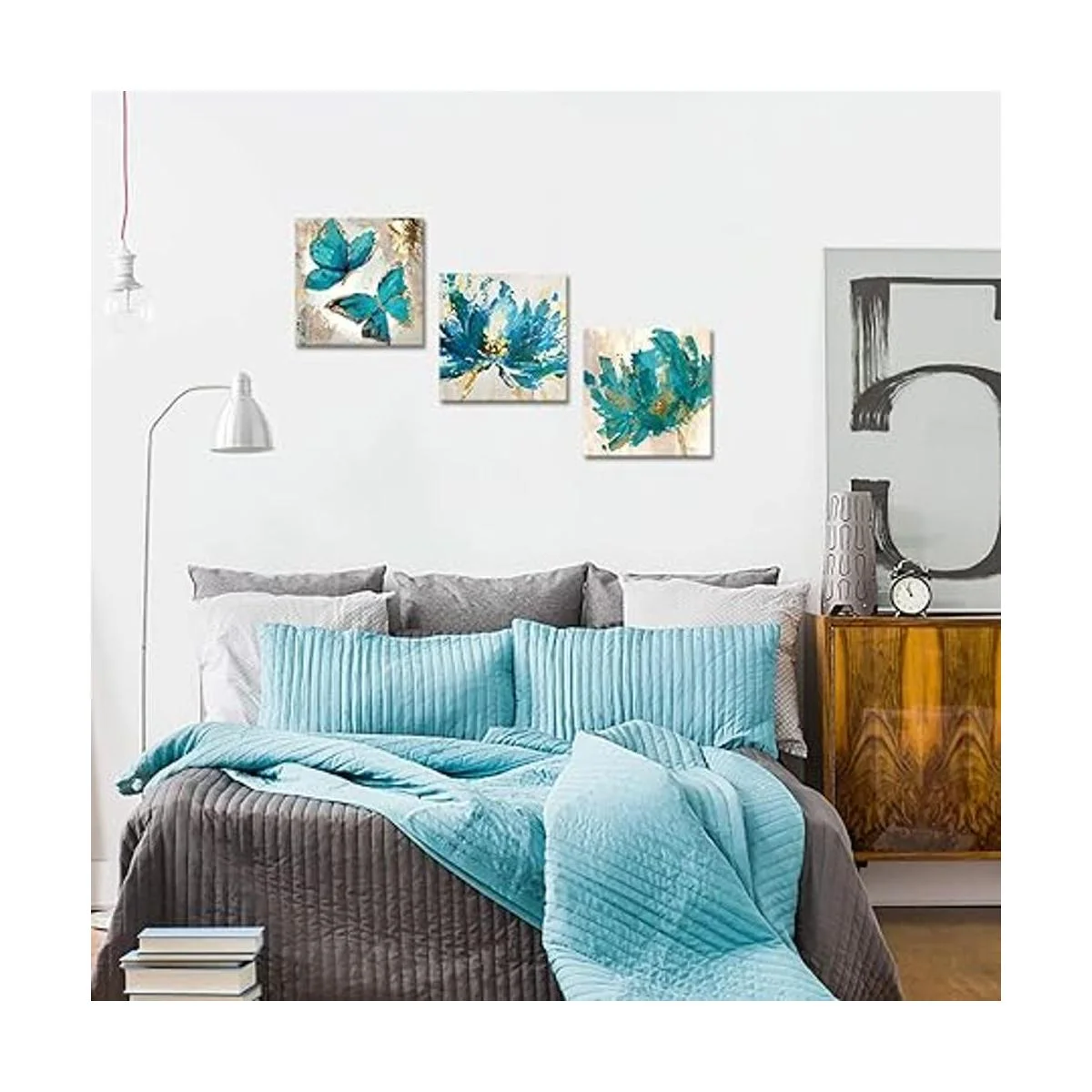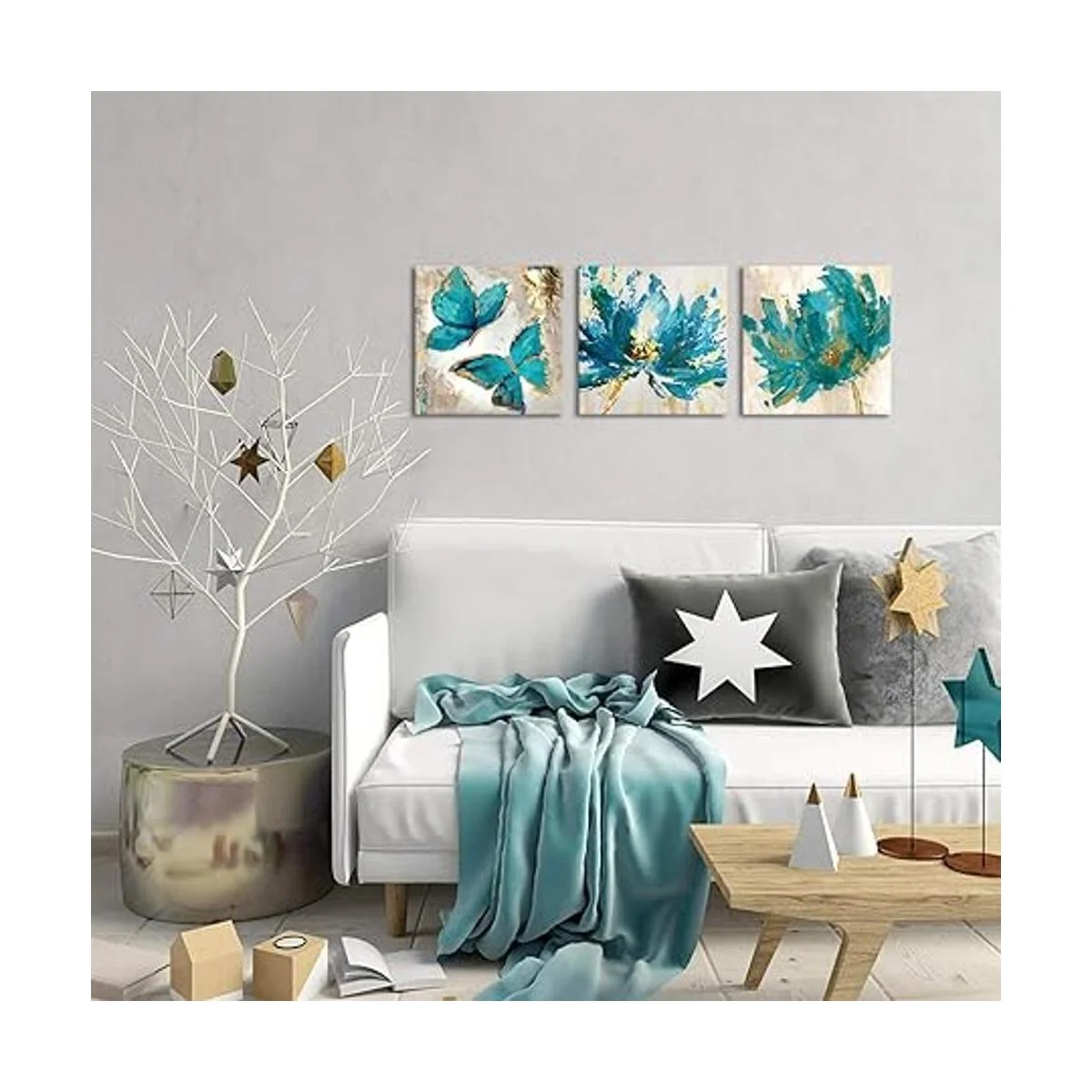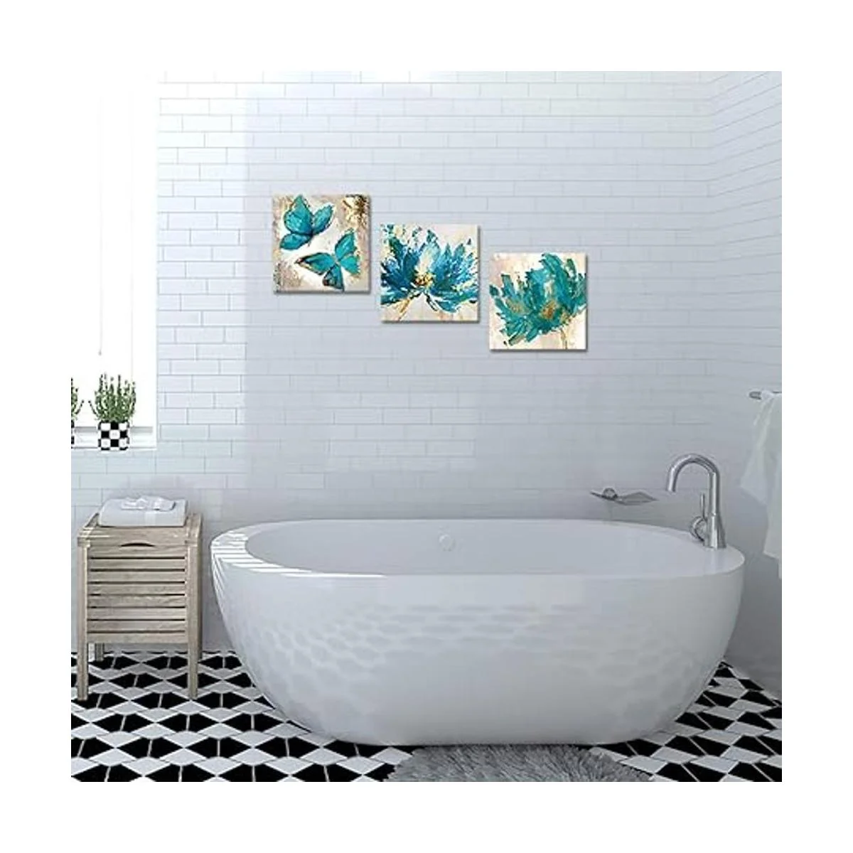 3 piezas de impresiones en lienzo de flores y mariposas, pintura al óleo floral azul dorado, arte de pared para baño, dormitorio, listo para colgar, cada tamaño, 12 x 12 pulgadas