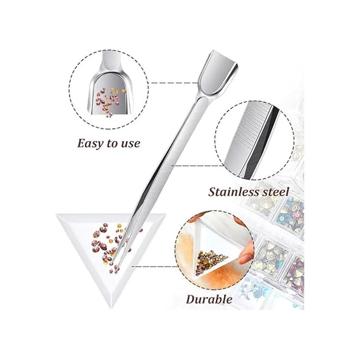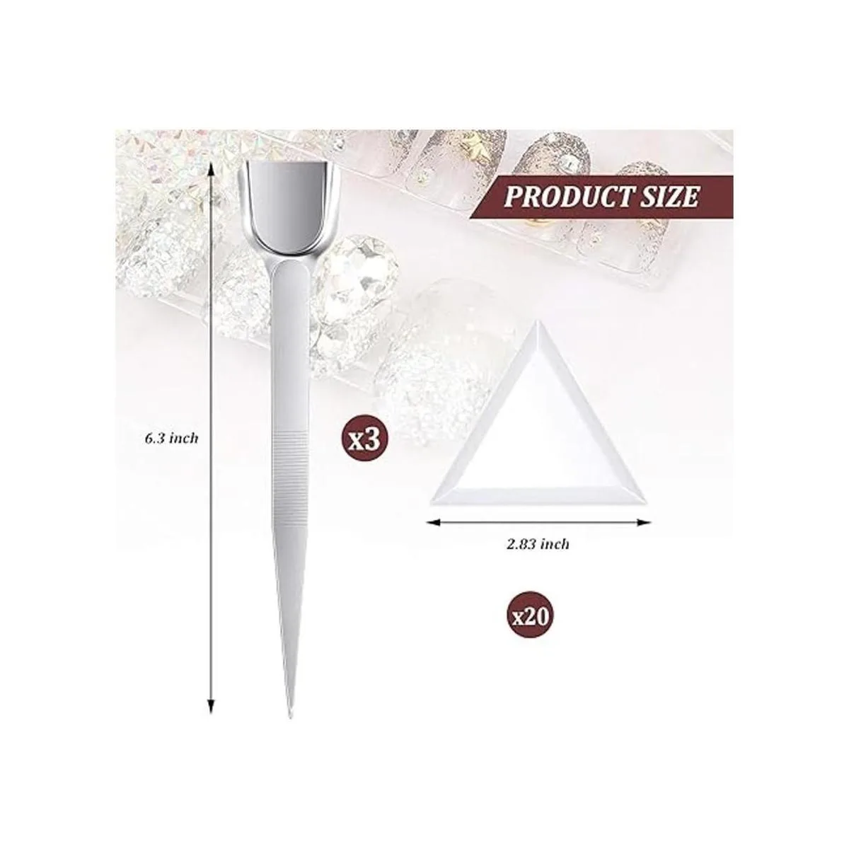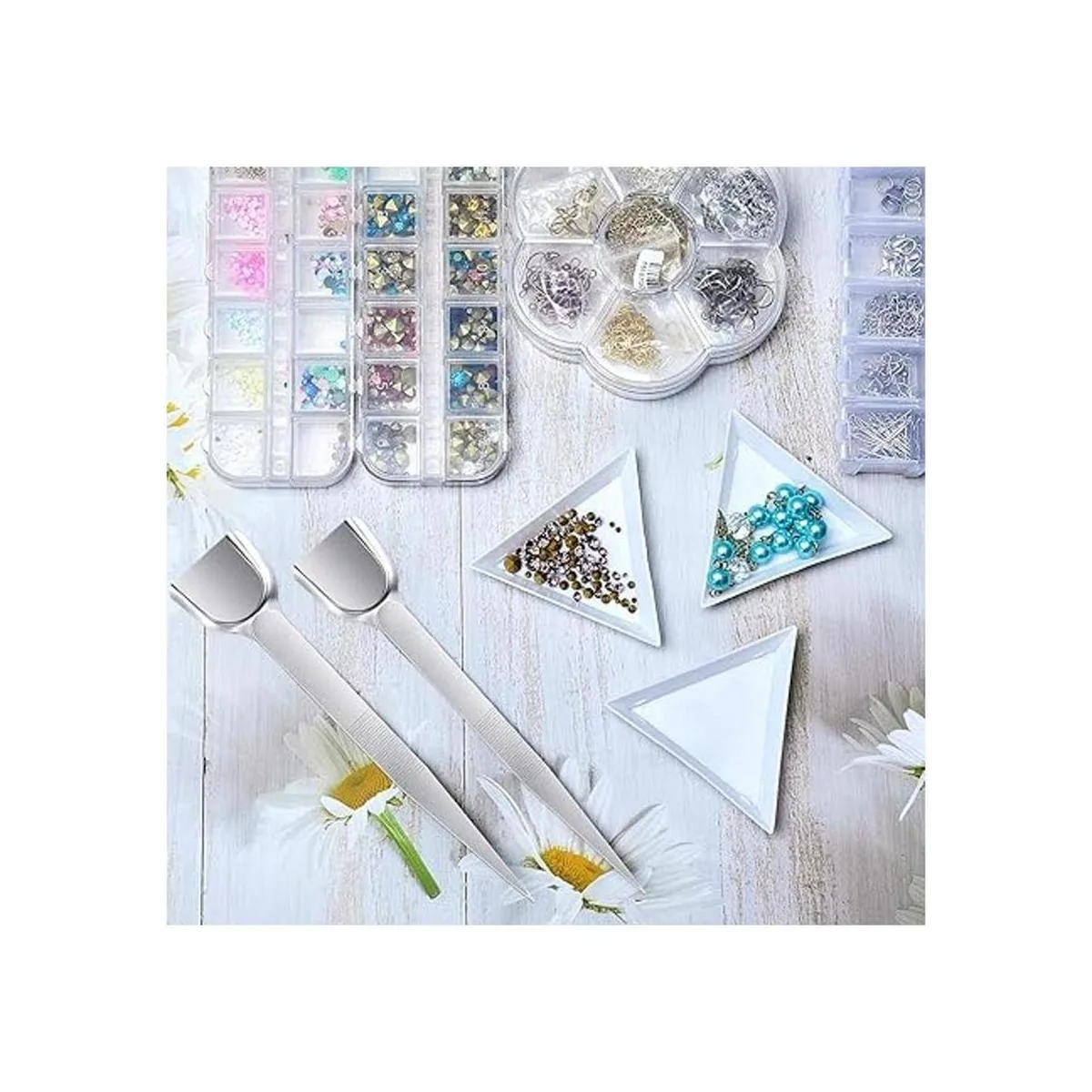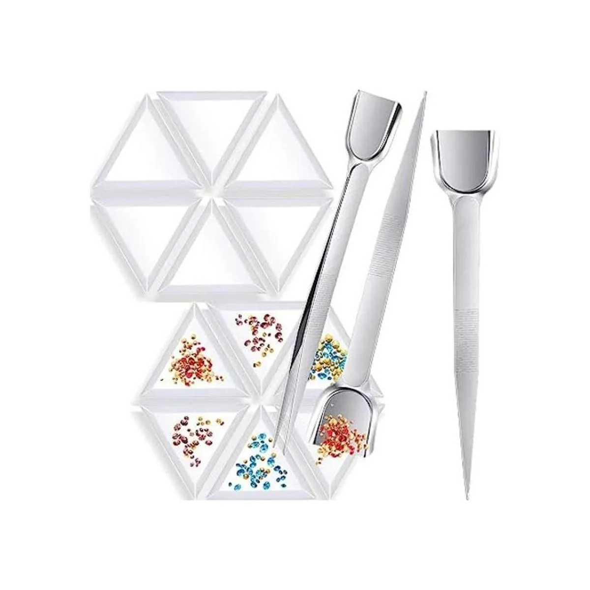 Medidas: las bandejas de plástico blanco con forma de triángulo miden aproximadamente 2.48 x 2.83 pulgadas de tamaño, y las pinzas de acero inoxidable con pala son de aprox. 6.3 x 1.0 in, dimensiones razonables para aplicar, puede ayudarte a contar pequeñas joyas y cuentas