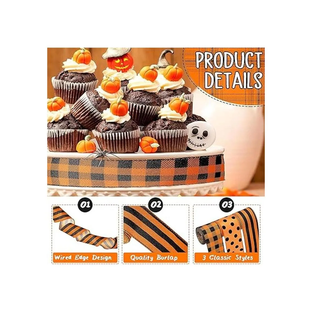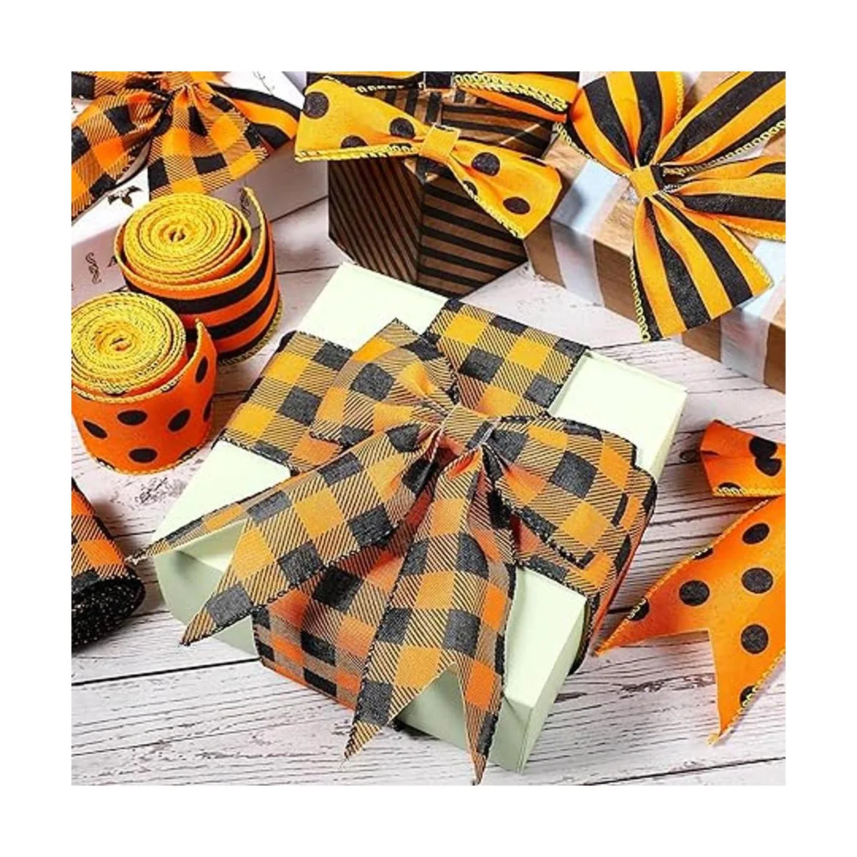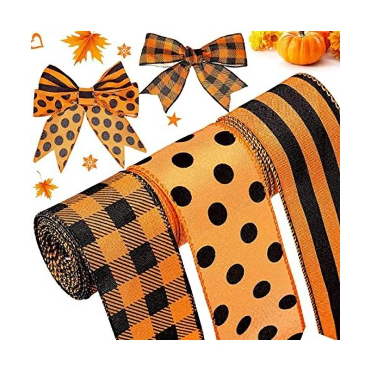 3 rollos de cintas de envoltura a cuadros naranja y negro, cinta de arpillera con alambre con patrón de puntos de Navidad, cintas a rayas para el hogar, manualidades, decoración de fiestas, 2.5 pulgadas x 15 yardas