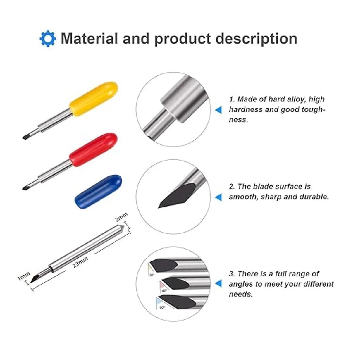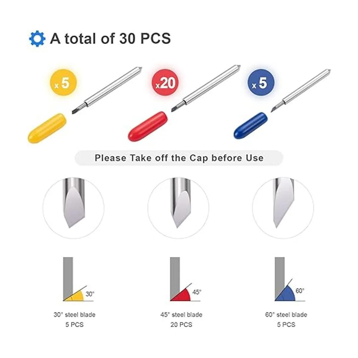 Lo que obtienes: 30 cuchillas de repuesto de aire Cricut Explore, incluyendo 5 cuchillas de corte poco profundas de 30 grados tapa amarilla 20 cuchillas estándar de 45 grados tapa roja 5 piezas de corte profundo de 60 grados tapa azul, 24 horas de servicio al cliente amigable.