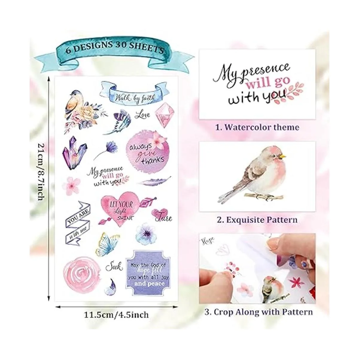Lo que puedes recibir: hay 30 hojas de calcomanías de acuarela en el paquete, que están disponibles en 6 diseños diferentes, cada diseño para 5 hojas; la cantidad abundante y los patrones ricos pueden satisfacer eficazmente tus diversas necesidades de decoración en la vida diaria