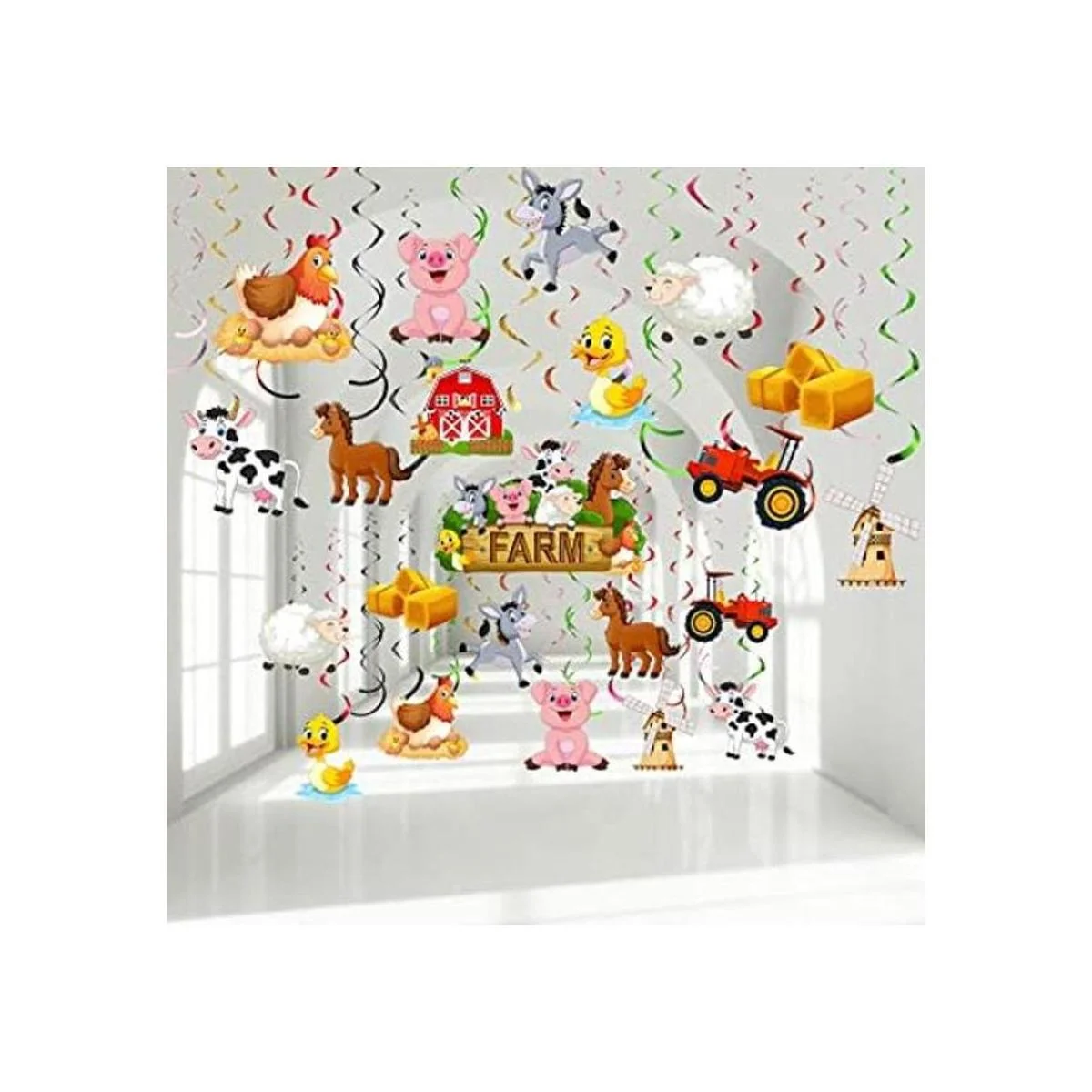30 piezas de decoración de remolinos colgantes para fiestas de animales de granja, suministros de fiesta de cumpleaños con temática de granero, remolinos de aluminio, decoración de techo para niñas y niños, suministros de baby shower