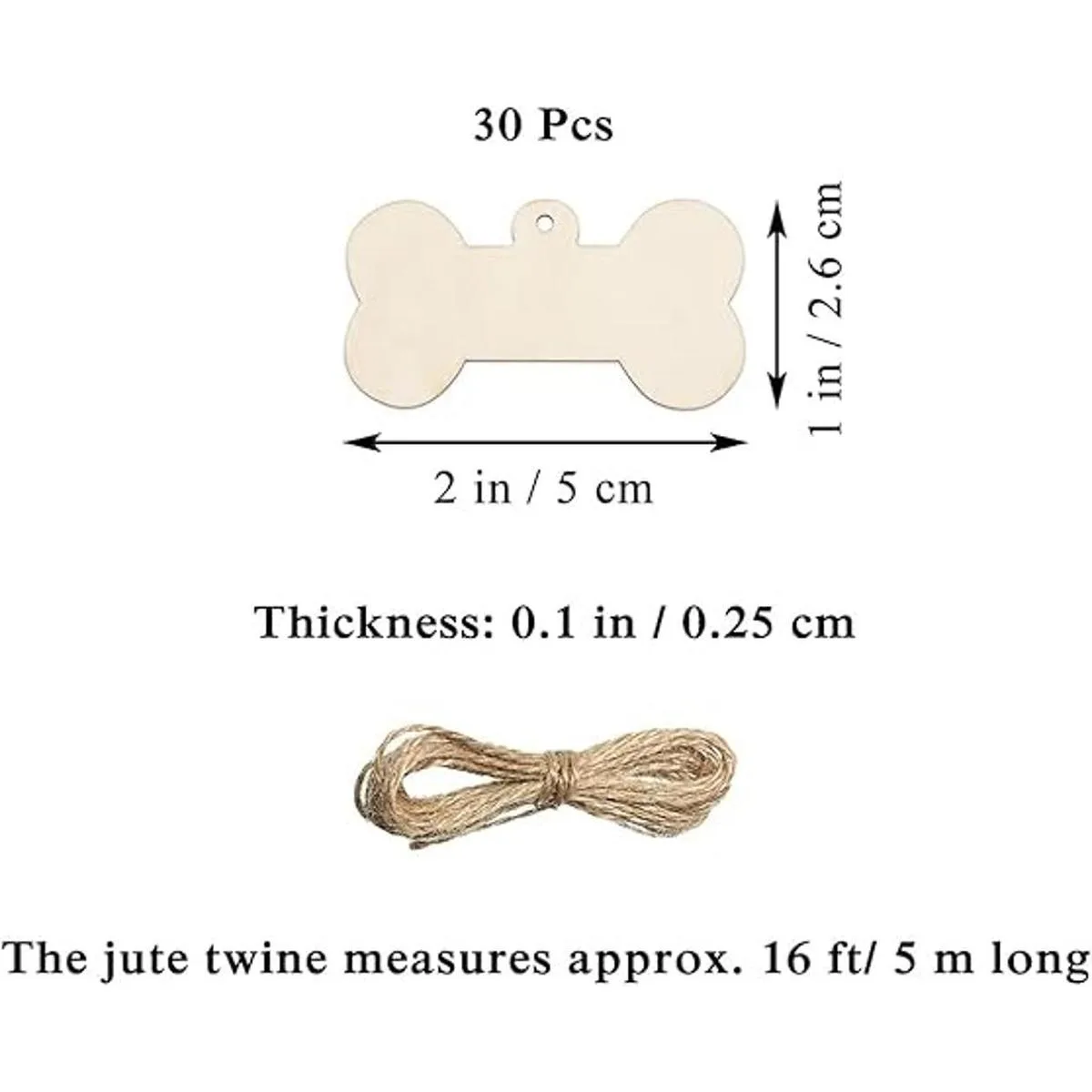 Paquete: paquete de 30 mini recortes de madera de hueso de perro y 1 cuerda de yute la cuerda de yute mide aproximadamente 16.4 ft de largo. Cada pieza de madera está bien pulida, las rodajas de madera en blanco están listas para pintar y escribir, puedes teñir, perforar, curvar y decorar como quieras.