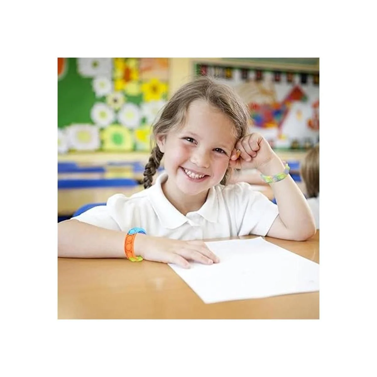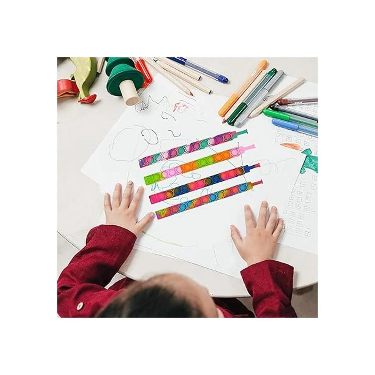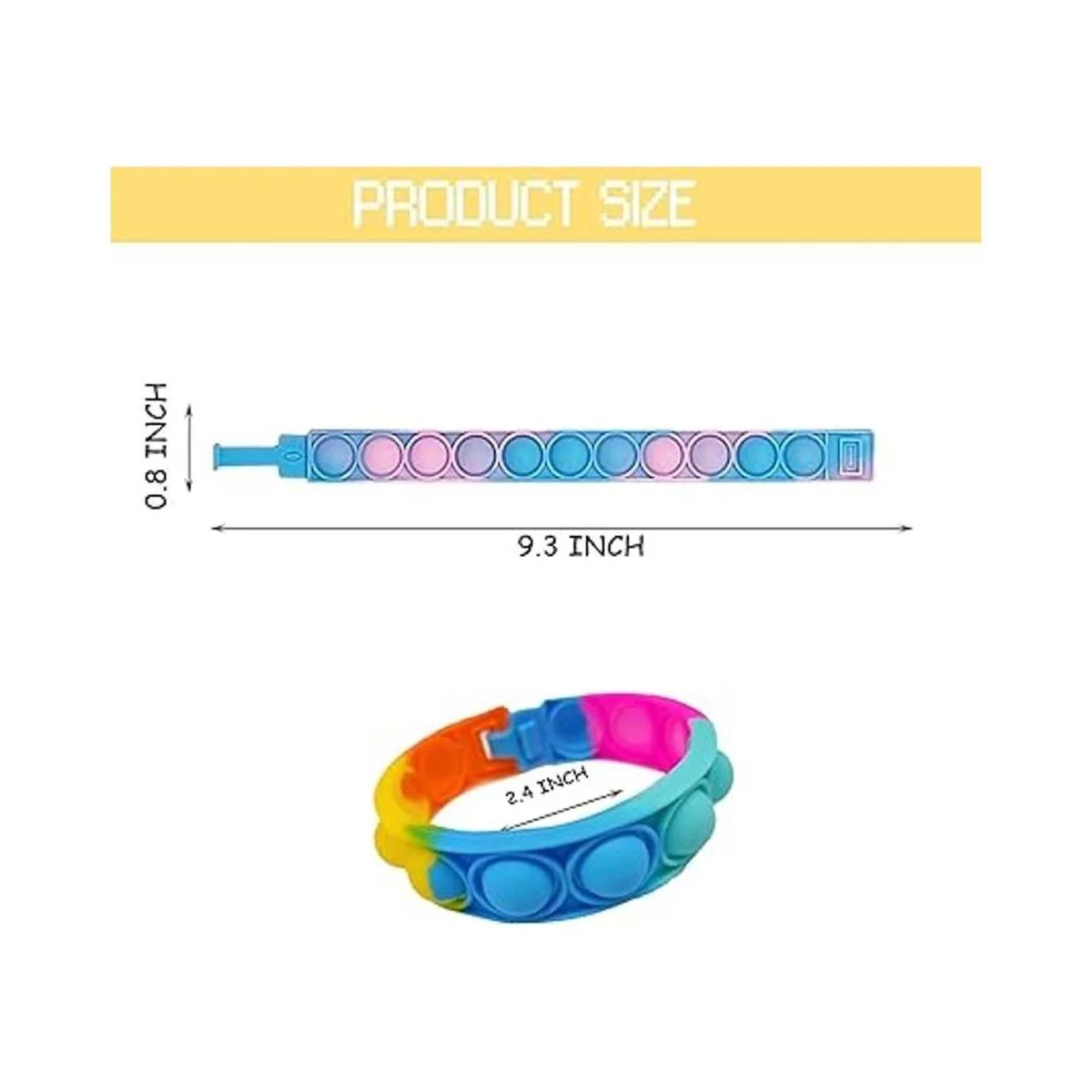 Tamaño: incluye 30 pulseras de burbujas para presionar, cada pieza mide 9.3 pulgadas de largo, 0.8 pulgadas de ancho y tiene un diámetro de aproximadamente 2.4 pulgadas después de ser abrochada.