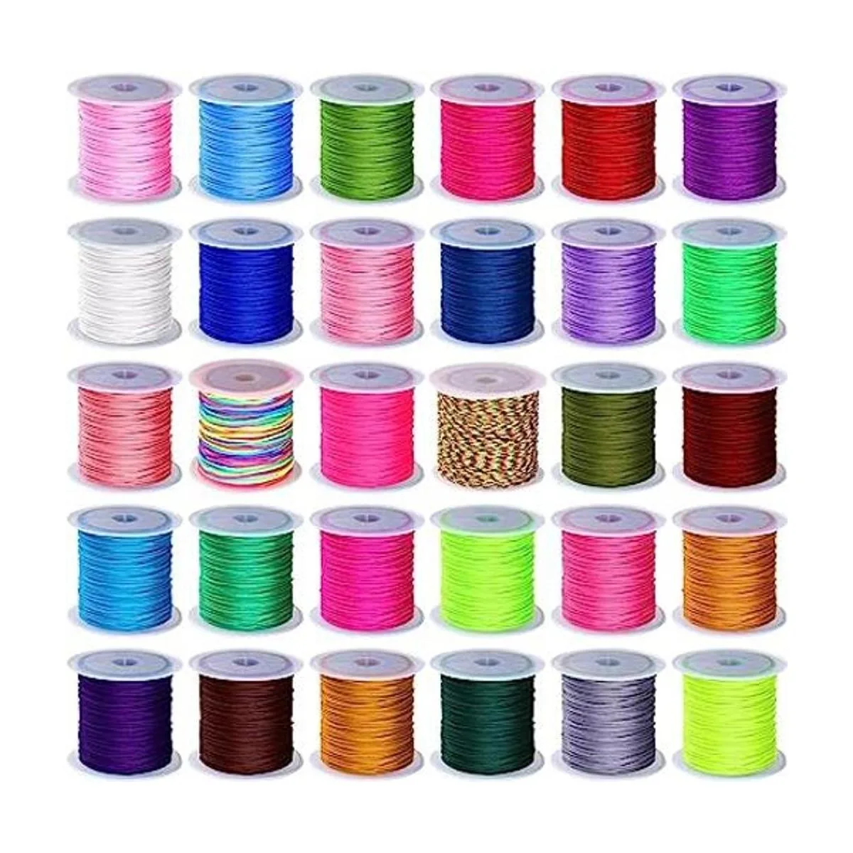Cantidad suficiente y colores para elegir: el paquete viene con 30 rollos de cuerdas de nailon para pulseras en 30 colores, incluyendo negro, marrón, rosa, verde, oro, rojo, azul y más, varios suficientes para satisfacer tus demandas de manualidades y mezcla
