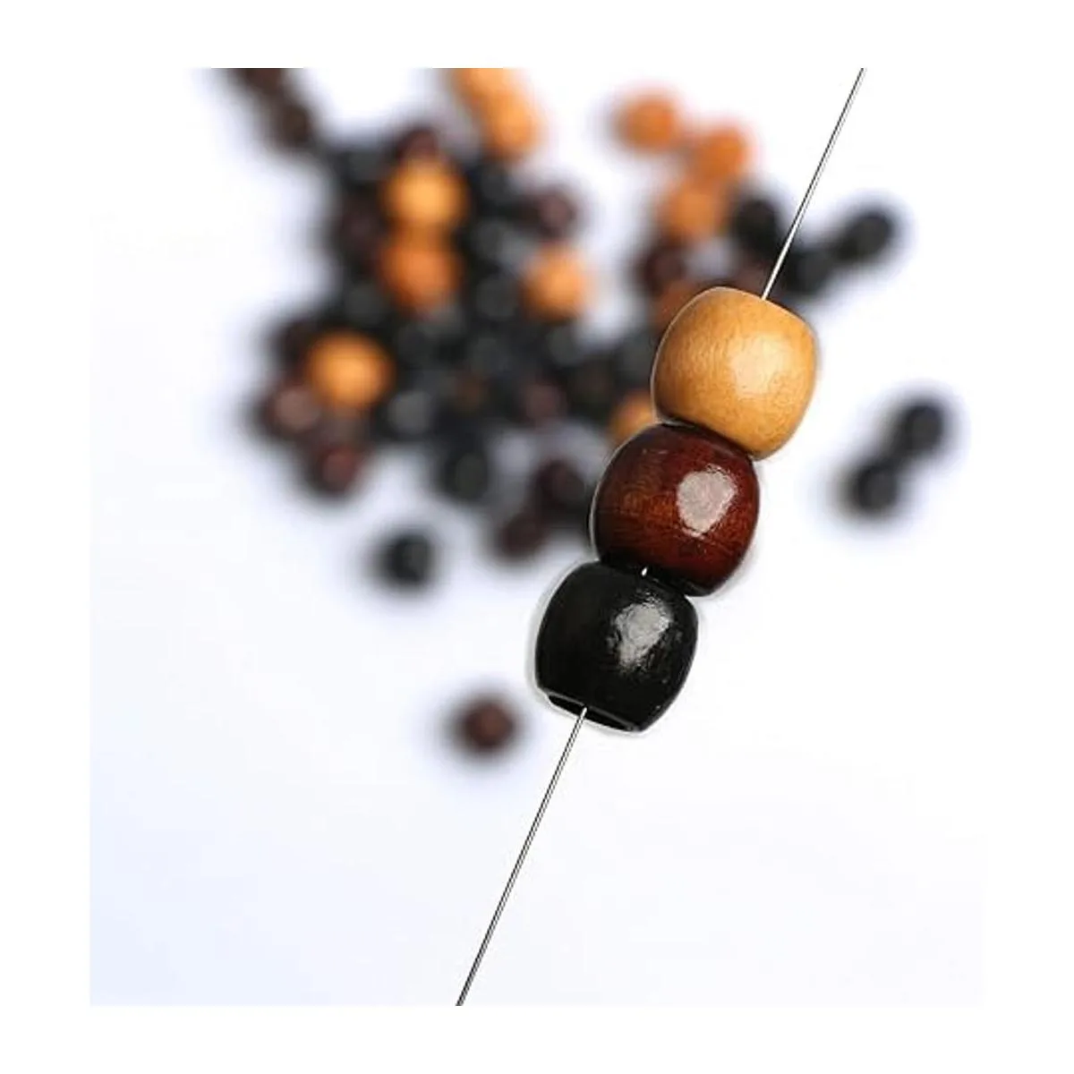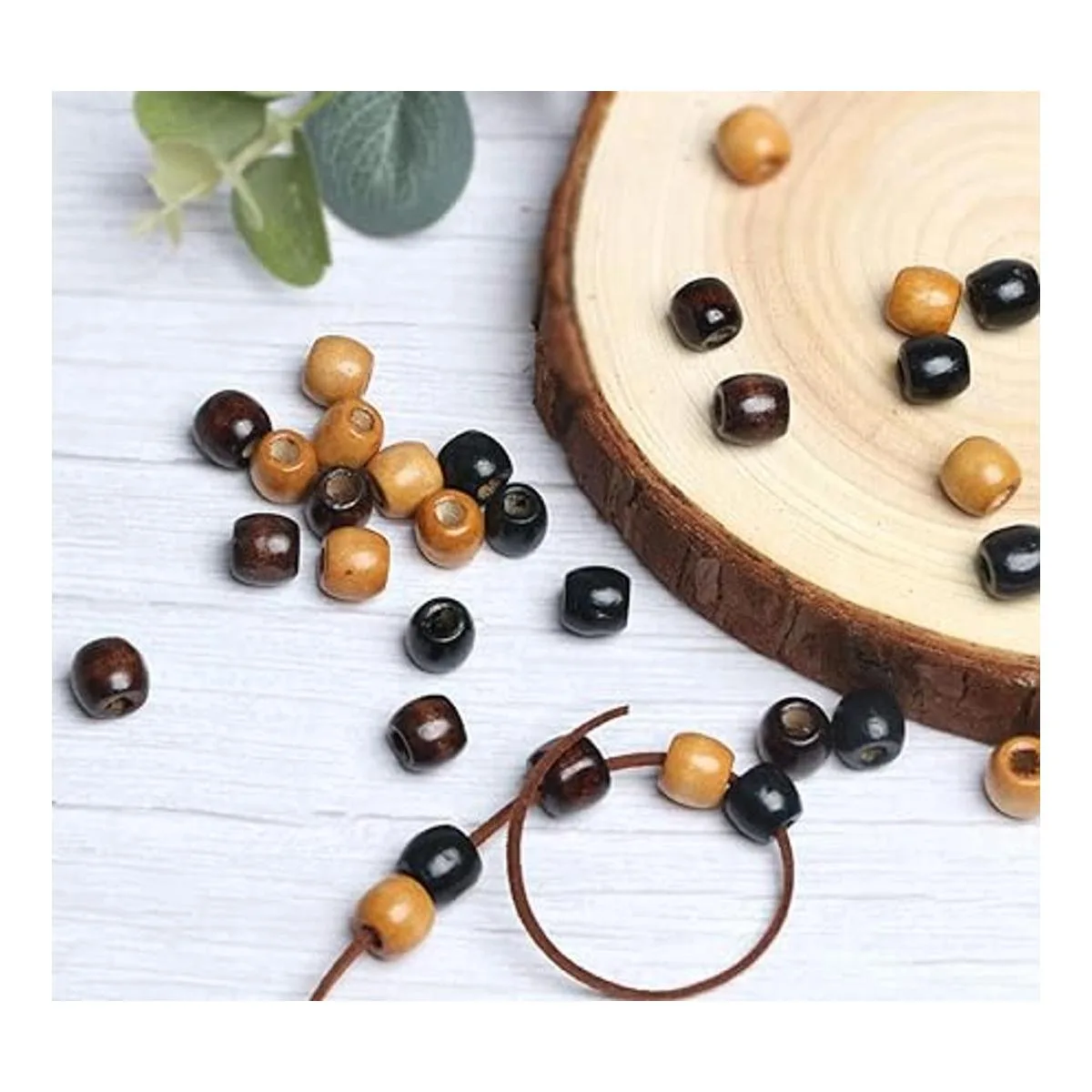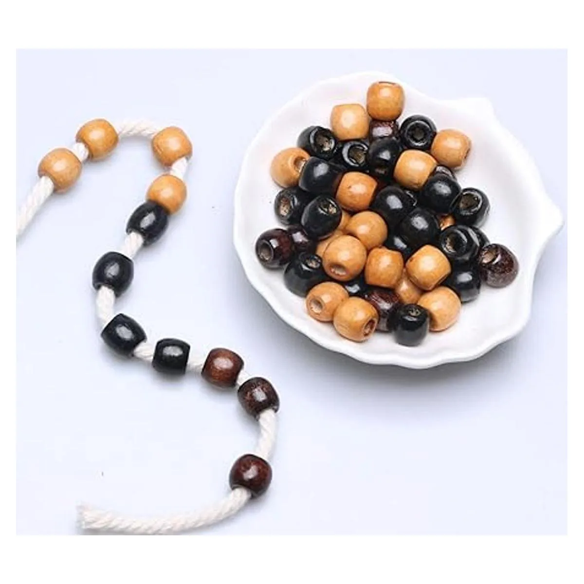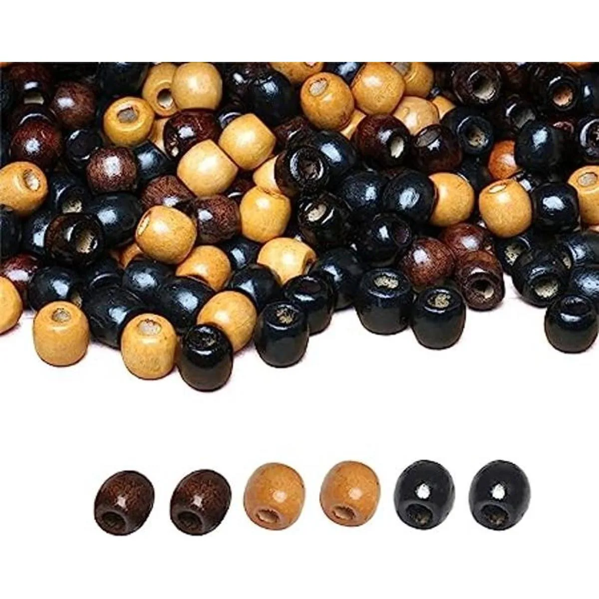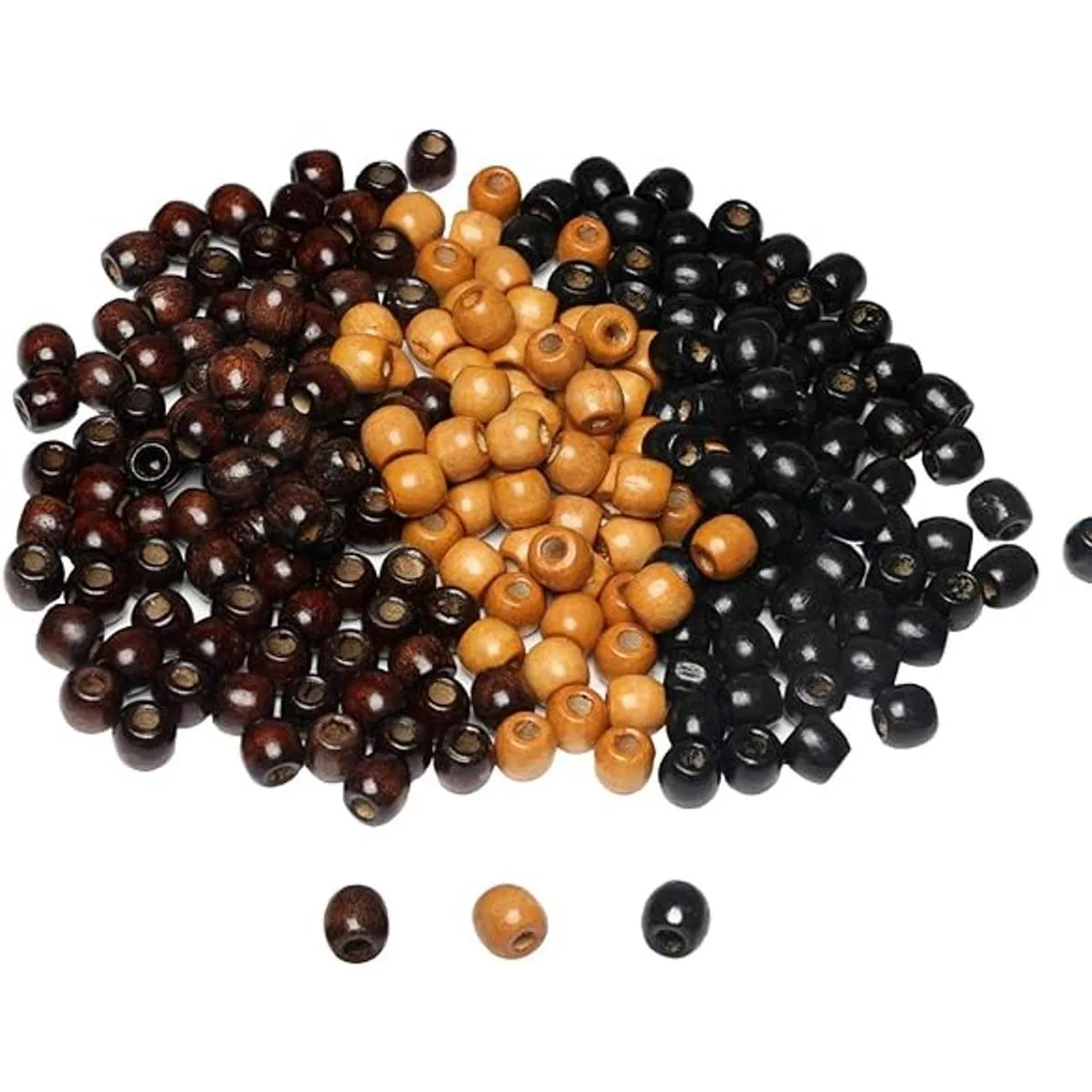 El paquete contiene 300 cuentas de madera con agujero grande, 100 unidades de color marrón claro, 100 unidades en marrón y 100 unidades en negro.