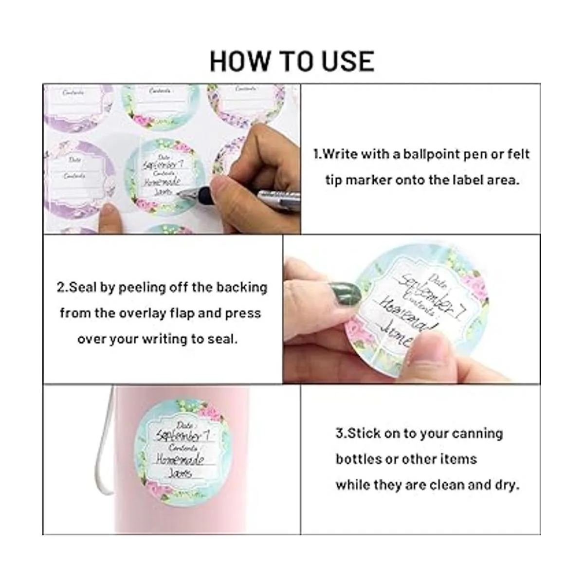 El paquete incluye: 4 diseños florales diferentes, 15 hojas, 300 etiquetas adhesivas para conservas. Cada etiqueta de tapa mide 2.0 in de diámetro.