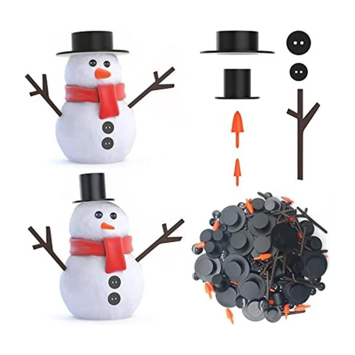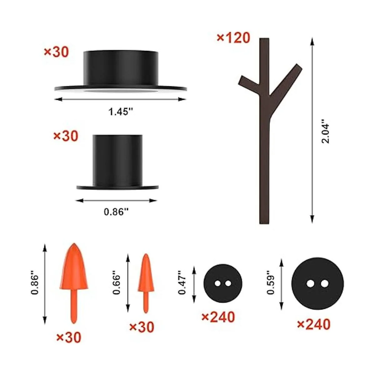 El paquete contiene: 60 botones de nariz de zanahoria en 2 tamaños diferentes, 60 mini sombreros negros en 2 tamaños, 360 botones negros en 2 tamaños y 120 manos de cartucho marrón.