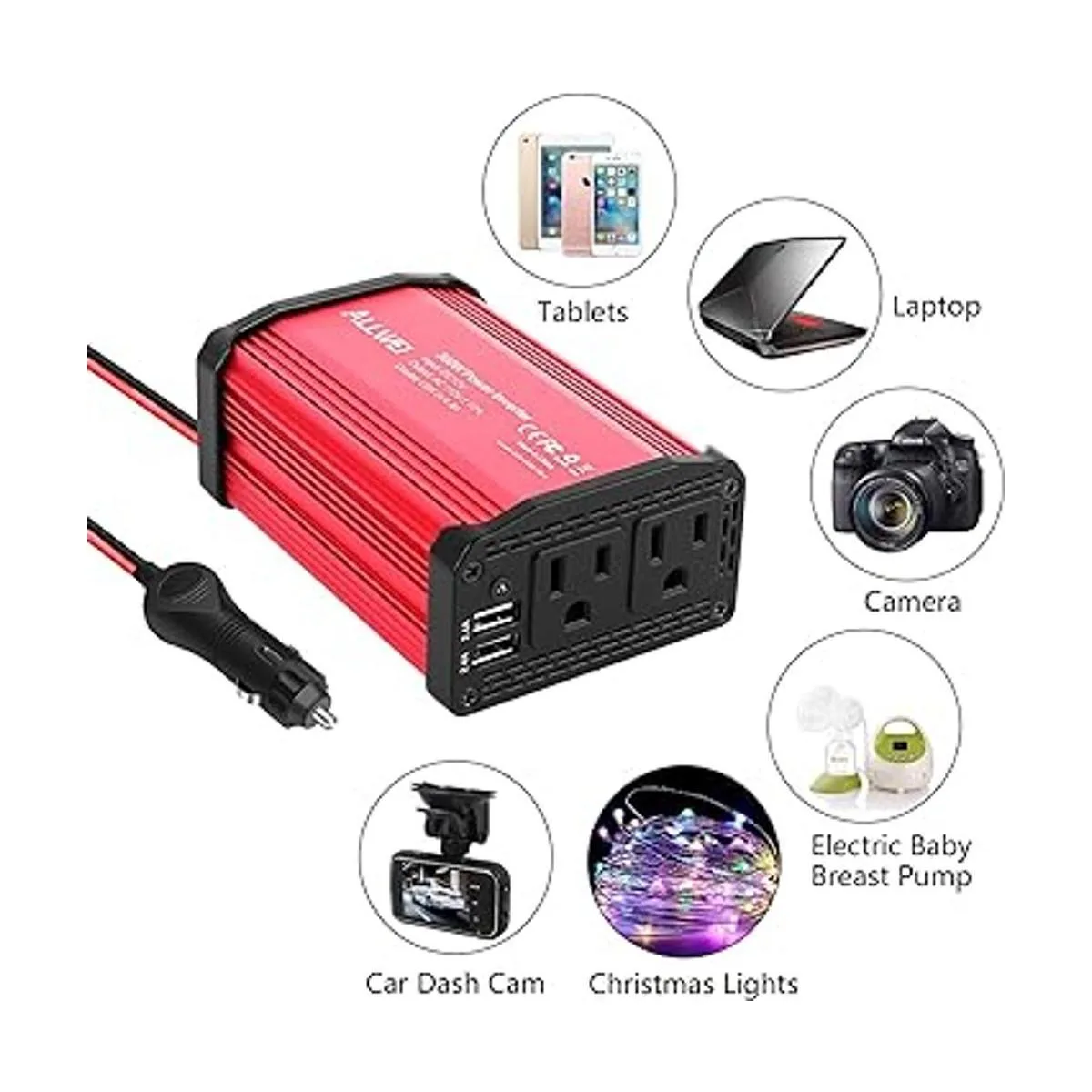 Inversor de potencia de 300 W de alta calidad: Proporciona 300 vatios de potencia continua de CC a CA y 600 vatios de potencia de pico. Ideal para cargar luces de cuerda, portátil, extractor de leche, máquina CPAP, nebulizador, consola de juegos, Kindle, TV, reproductores de DVD, luces, iPad y otros dispositivos electrónicos.