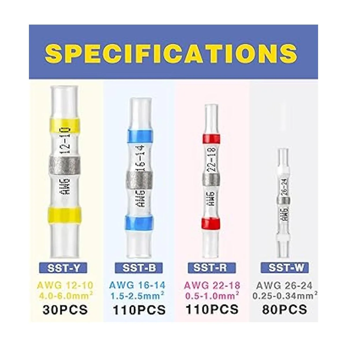 330 conectores de alambre de sellado de soldadura, conectores de alambre termorretráctiles de grado marino, conectores de extremo termorretráctiles, soldadura automática para electricidad, estéreo 30 amarillo 80 blanco 110 rojo 110 azul