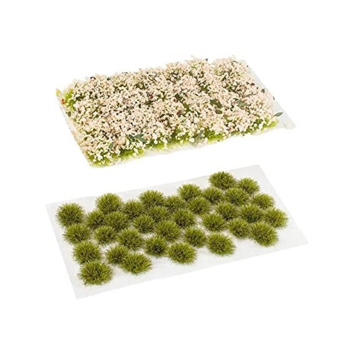 35 piezas de césped estático modelo de mechones de hierba, césped artificial ferroviario y 28 piezas de mechones tupidos de flores rosadas, grupos de vegetación para bricolaje arquitectura, modelo de construcción, tren, paisaje, paisaje ferroviario