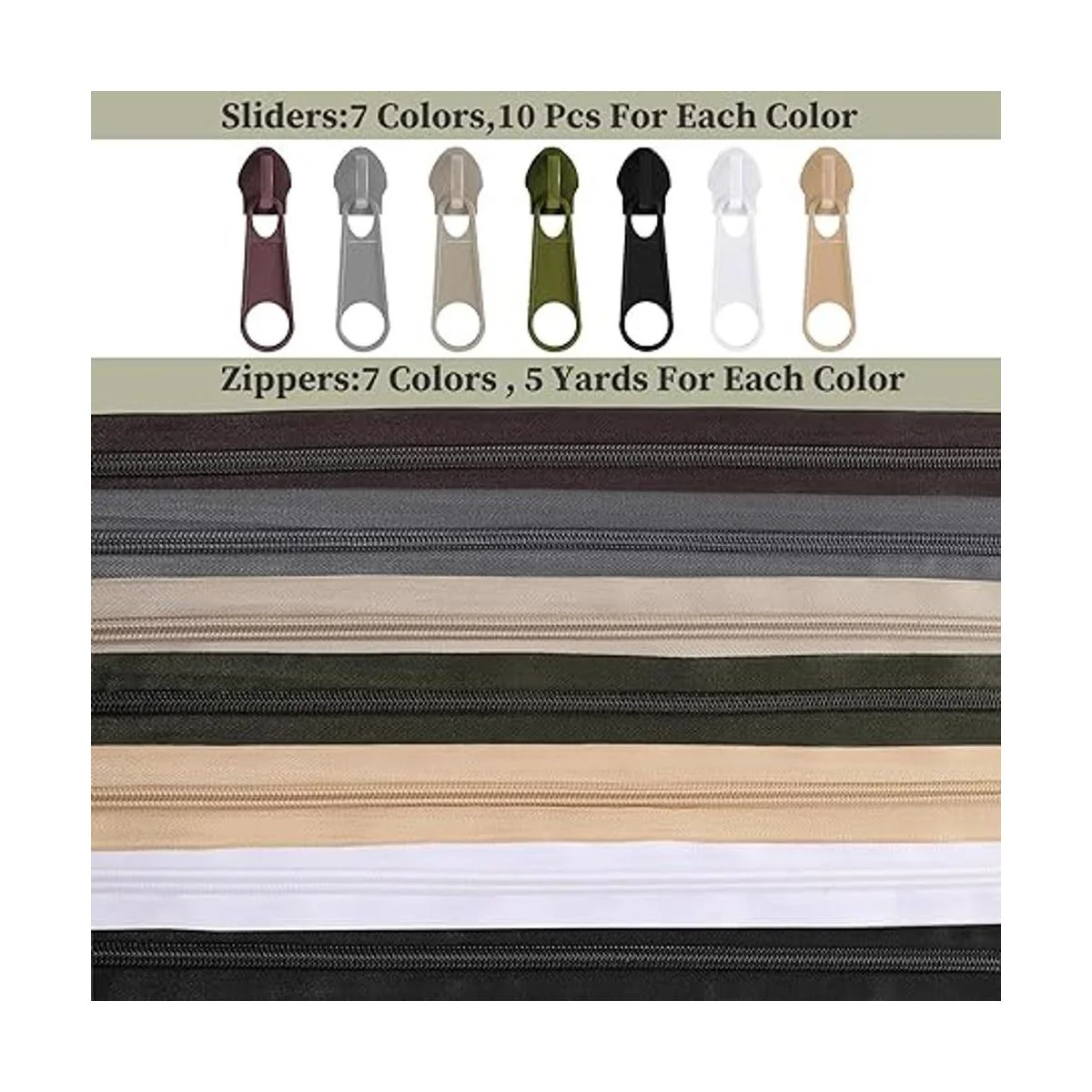 35 yardas7 piezas de varios colores, 5 cremalleras de bobina de nailon, cremalleras de costura mixtas con 70 cabezales de cremallera deslizantes para manualidades, costura, suministros de manualidades multicolor